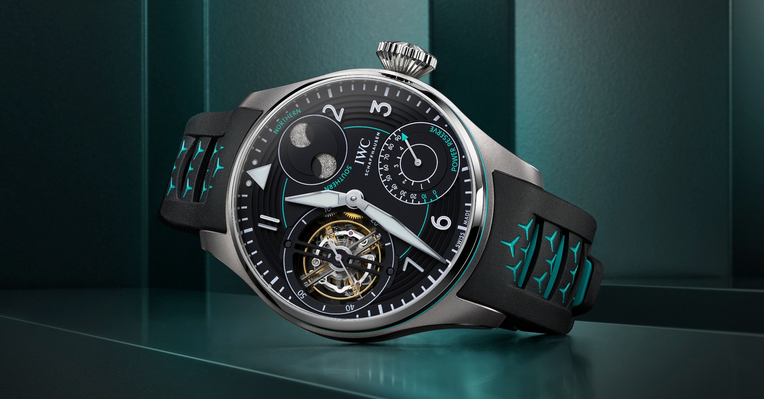There are of course aesthetic nods to the AMG One, including a louvred, ring-shaped structure of the outer dial ring in Mercedes-AMG F1 Petronas green that takes inspiration from the hypercar’s air inlets. In addition to a double moon phase display for the northern and southern hemispheres, the black dial features a power reserve display at 4 o’clock, reminiscent of a tachometer. The two-tone rubber strap is also adorned with Mercedes stars in Petronas green.