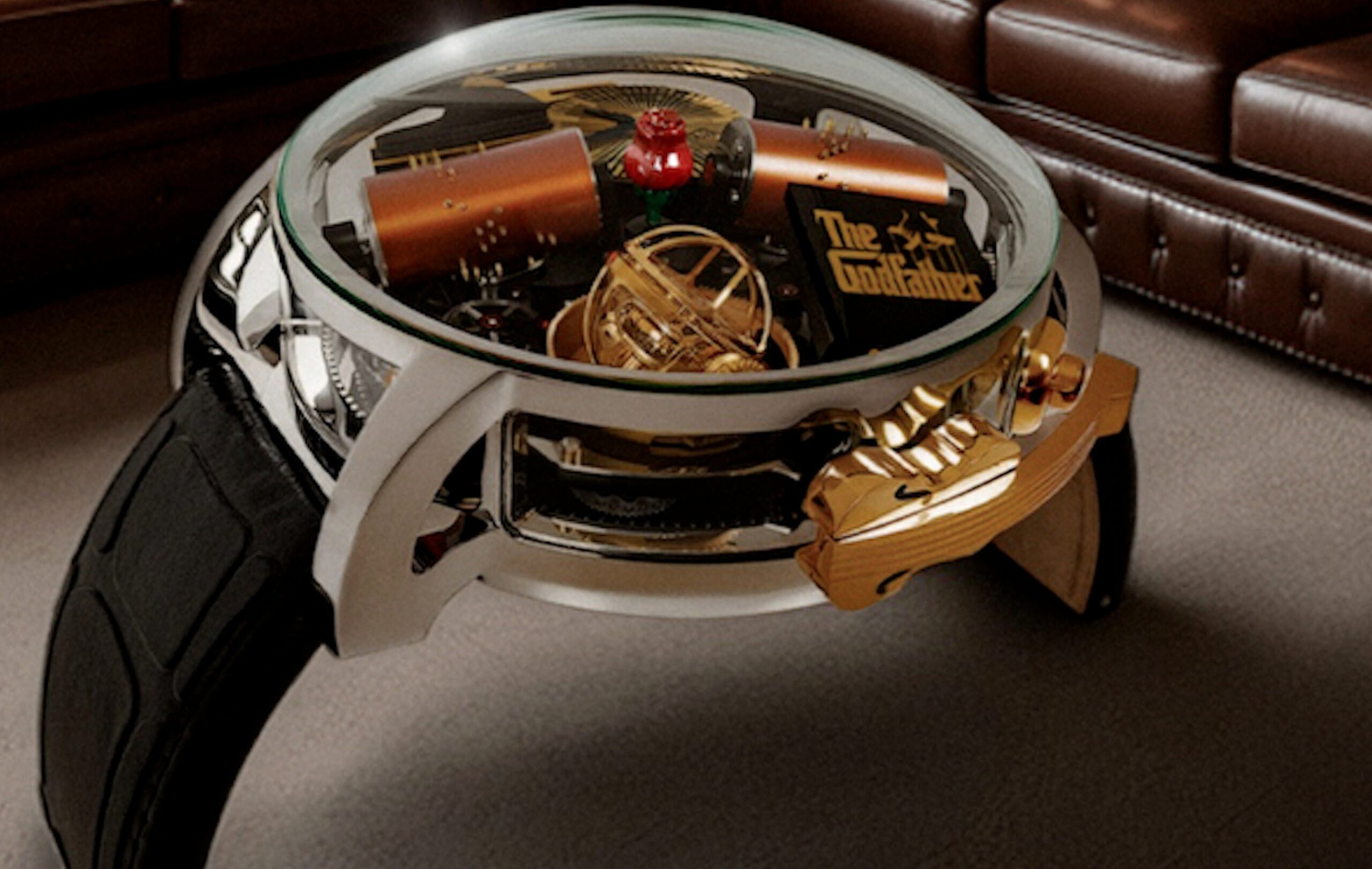At the heart of the sculpture lies a Swiss and German mechanical movement, a tribute to the table’s watchmaking origins. This complex mechanism boasts a 7-day power reserve, providing both a functional and artistic core. Echoing the watch that inspired it, the table also features intricate music boxes that play the iconic “The Godfather” theme by Nino Rota, adding a multi-sensory dimension to the piece. The design further incorporates scaled-up elements from the timepiece, including detailed violin- and piano-shaped parts and a tri-axial tourbillon, showcasing the seamless fusion of engineering and artistic design.