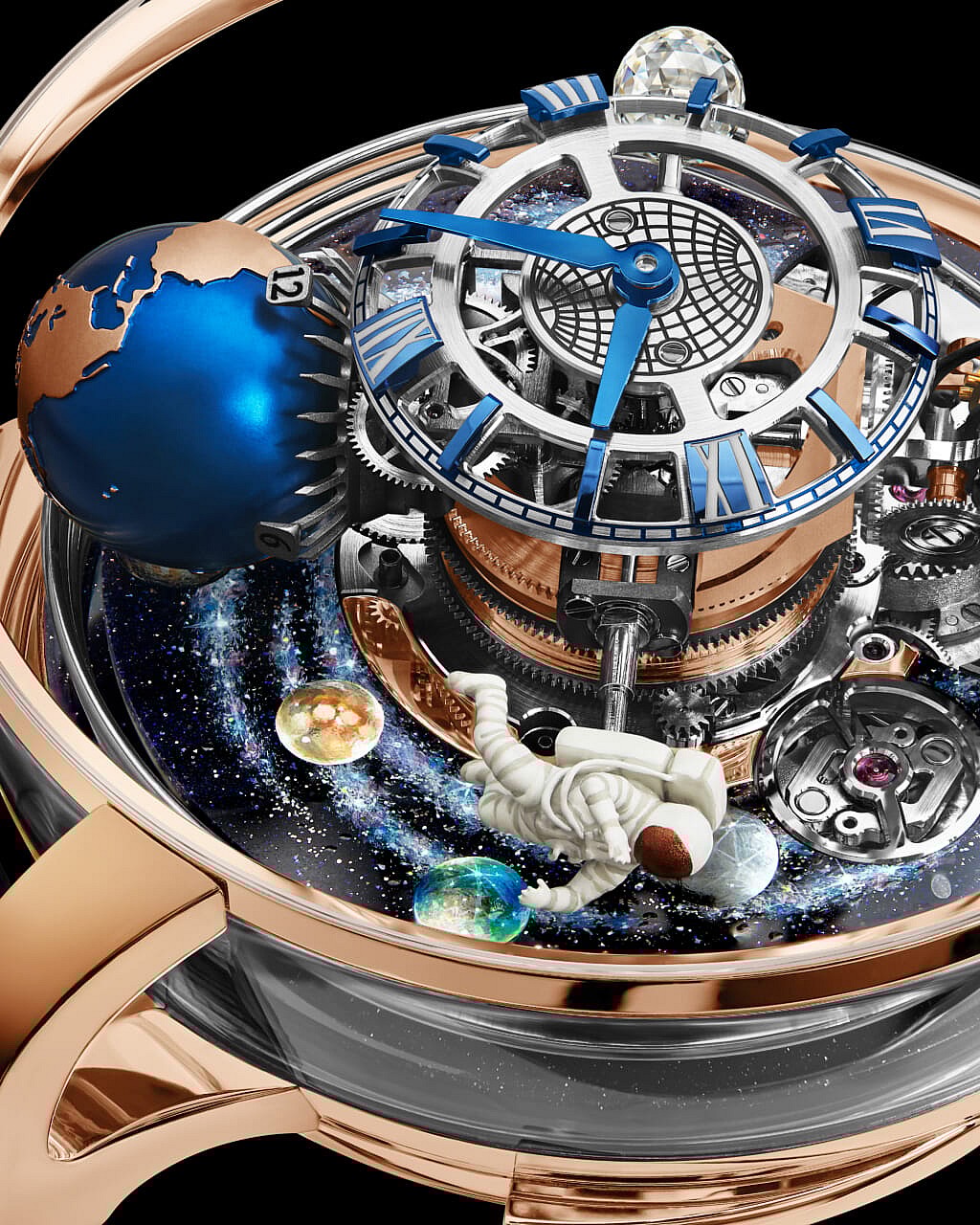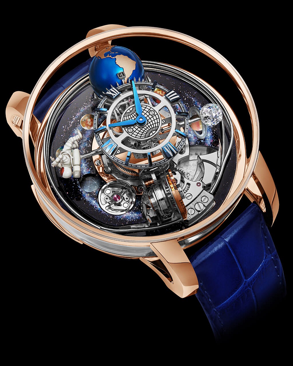 The hand-painted astronaut orbits along with the three other arms of the caliber, passing over the painstakingly detailed Milky Way backdrop. The watch’s four arms also carry the gravitational triple- axis tourbillon. A date and moon-phase display features a bi-color “Jacob-Cut” spherical diamond.