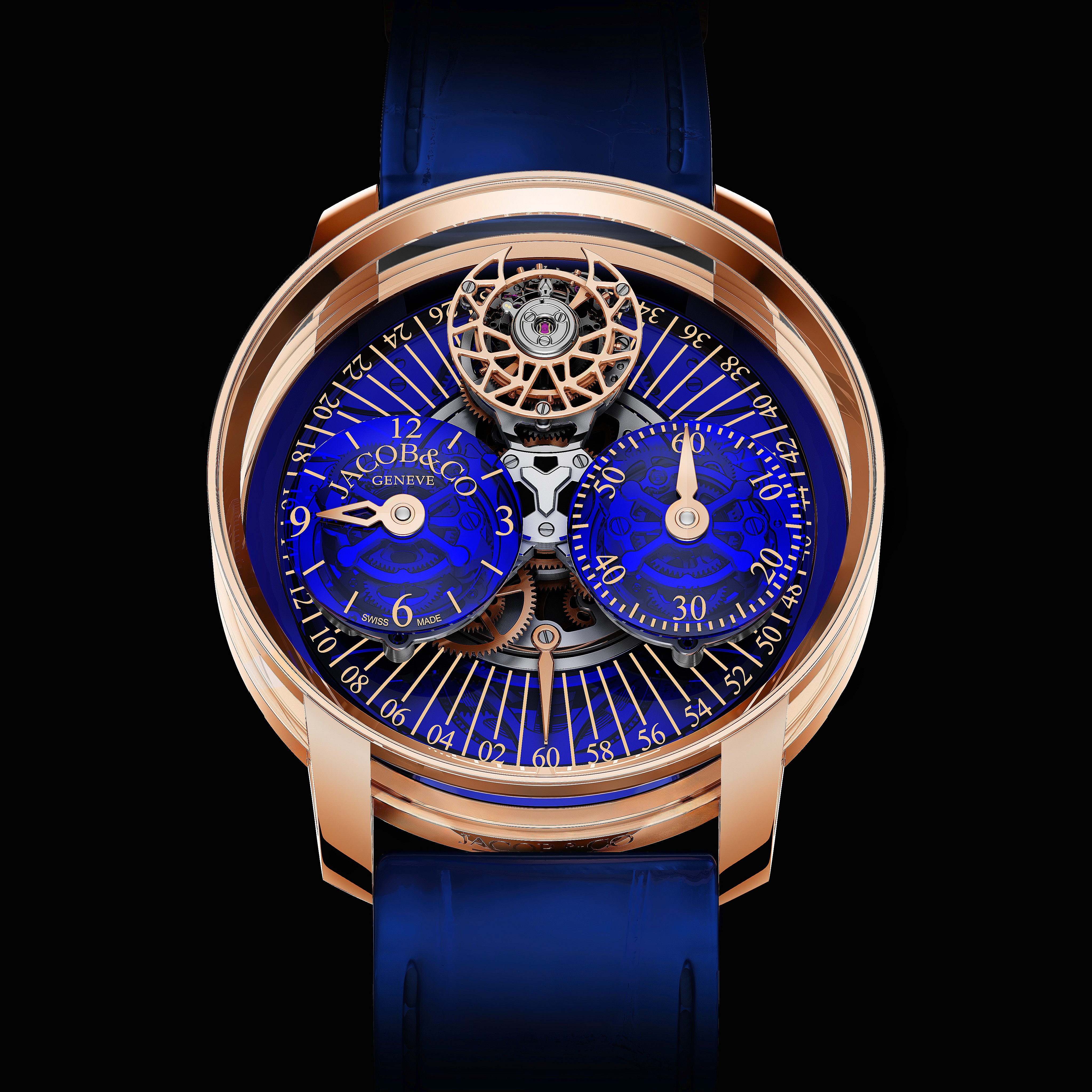 Its engine is the 552-piece caliber JCAM56, featuring a world-first rotation speed of 60 seconds and three three arms. One arm is flying tourbillon that completes one rotation per minute on two axes—Jacob & Co. notes that this technically makes the timepiece a double-axis flying tourbillon. The other two arms show the minutes and hours on brilliant blue polycarbonate subdials with white printed scales.