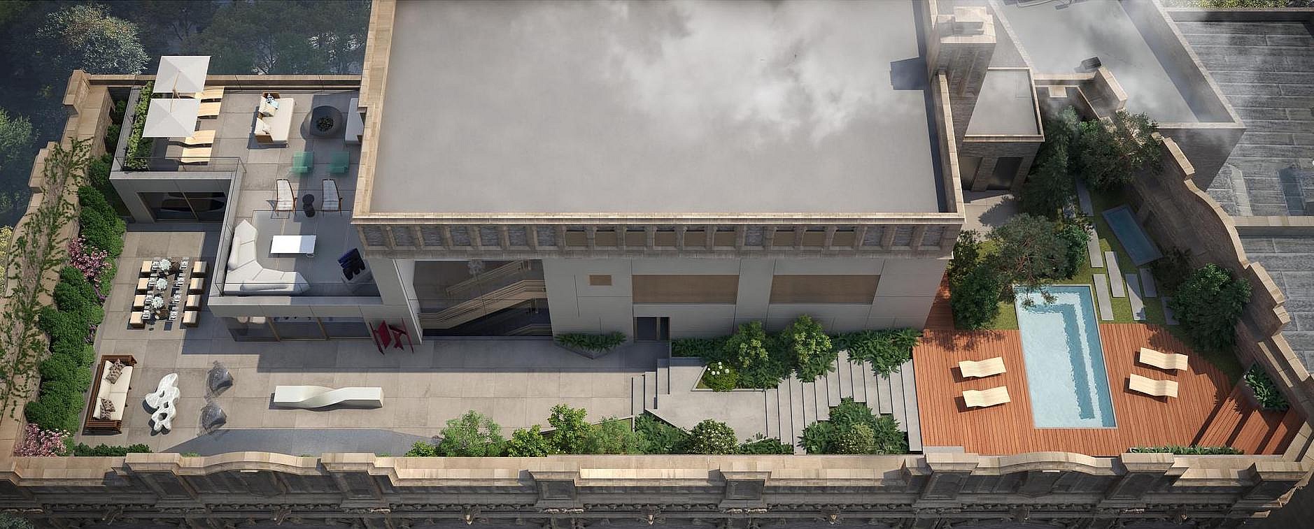 It also has a private elevator, grand ballroom, a library with a marble and glass fireplace, and an observatory on the third floor that opens up into a 950-square-foot terrace with views of the Empire State Building, Flatiron Building, and World Trade Center.