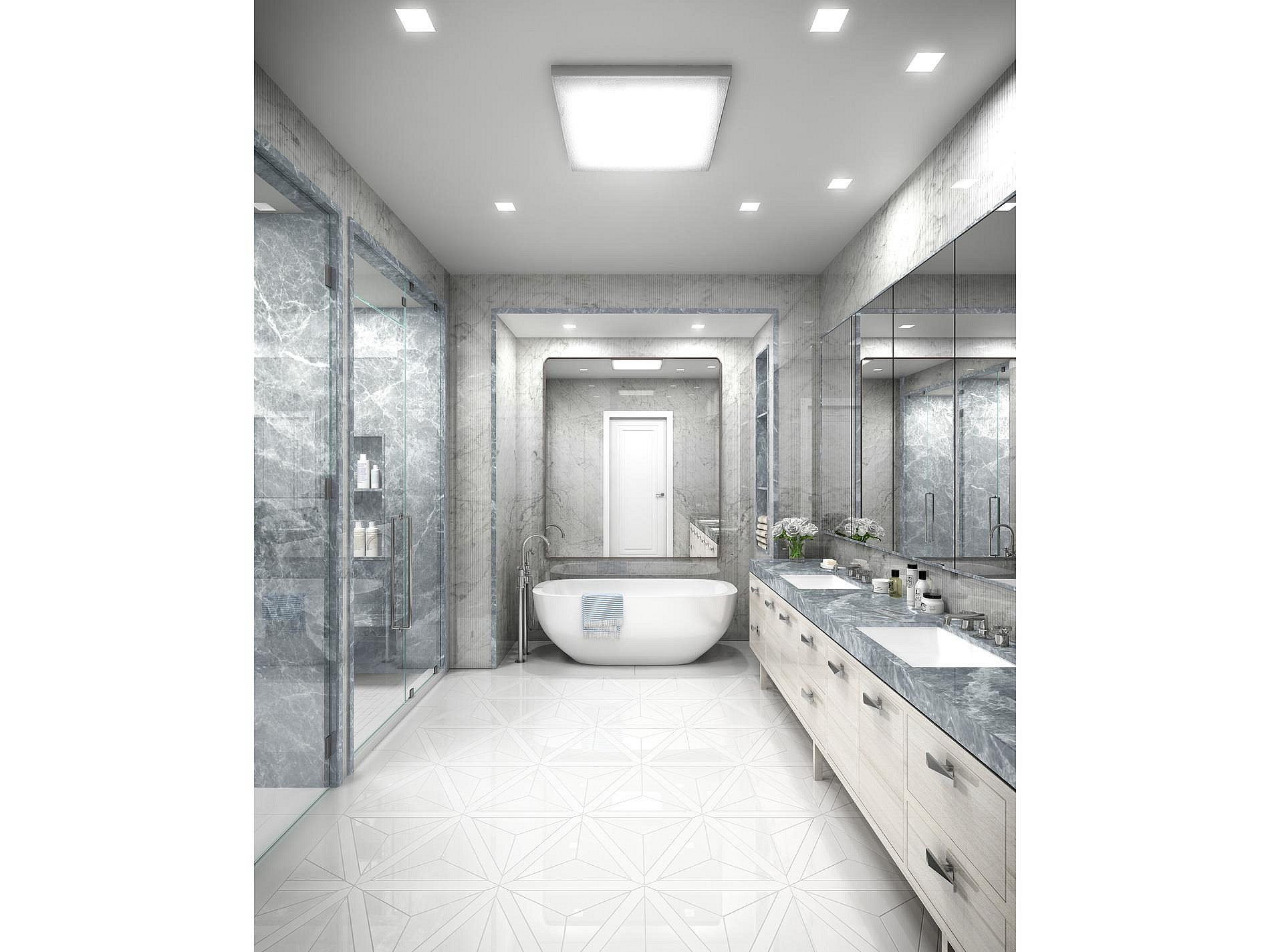 Plus there are “floors of solid oak and marble, a custom kitchen with Ash mill-work, marble counters and top-of-the-line Gaggenau appliances, and bathroom finishes that include honed, polished and fluted marble and hand-dyed sycamore cabinetry” according to the listing on StreetEasy.