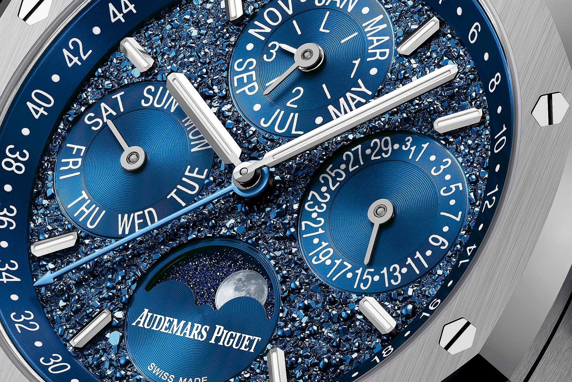 Power comes from the self-winding Calibre 5134—AP’s final implementation of the 40-hour movement in a limited-edition timepiece—allowing it to display the week, day, date, moon cycle, month, hours, minutes and leap year.