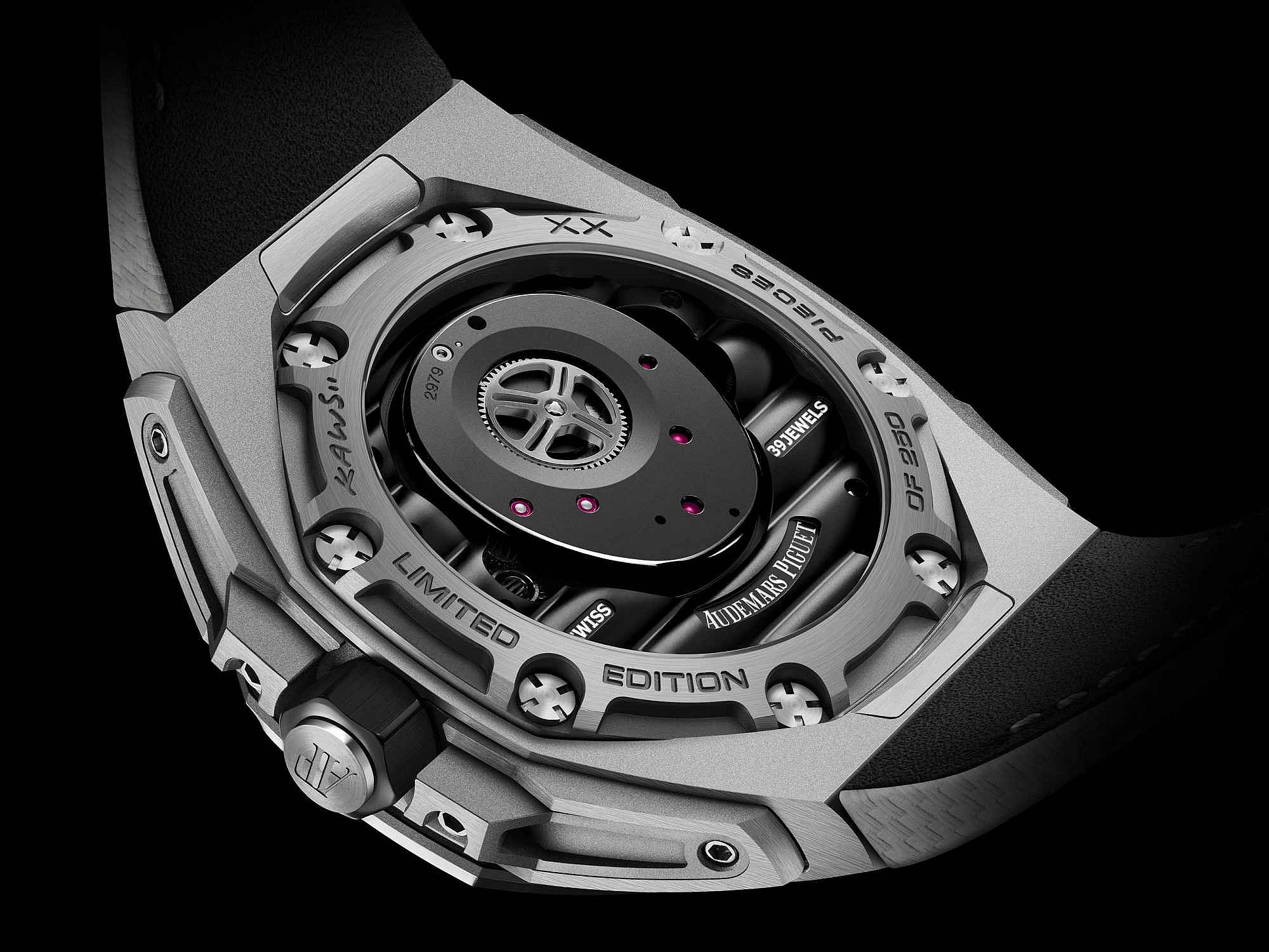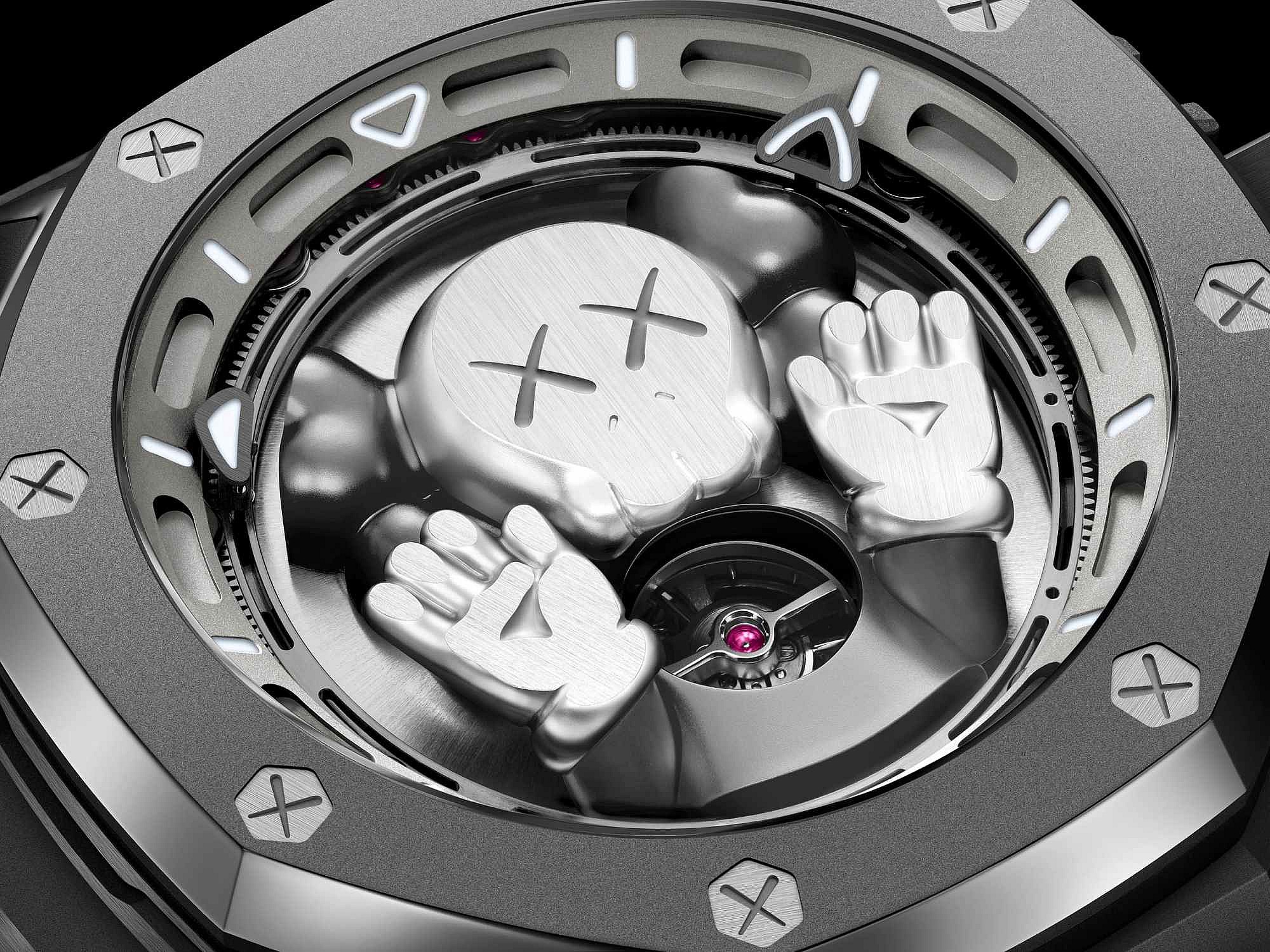 A 3D edition of KAWS’ somewhat menacing Companion figure adorns the dial within the sandblasted titanium case, pressing on the dial itself, while the timekeeping mechanism now rests on the edge of the dial. The change in structure of the timekeeping display offers an “unobstructed view of this cartoon-like character in shades of grey,” Audemars Piguet said.
