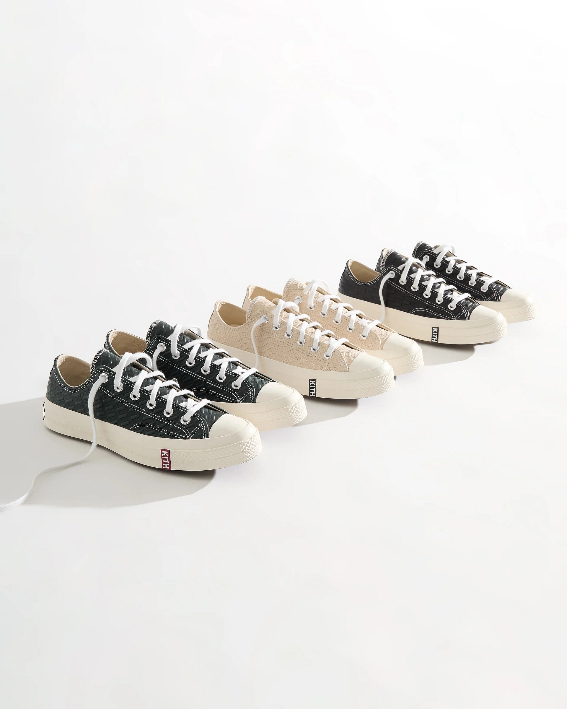 The Green Scarab version, also in leather, features the Deco version of the monogram, which tilts the Classic pattern at an angle. The Beige execution, crafted from canvas, offers a wavy variation of the “KITH” logo. All three shoes also get Kith Classic branding on the midsole, the vintage All Star heel cap, and Converse’s signature white rubber outsole.