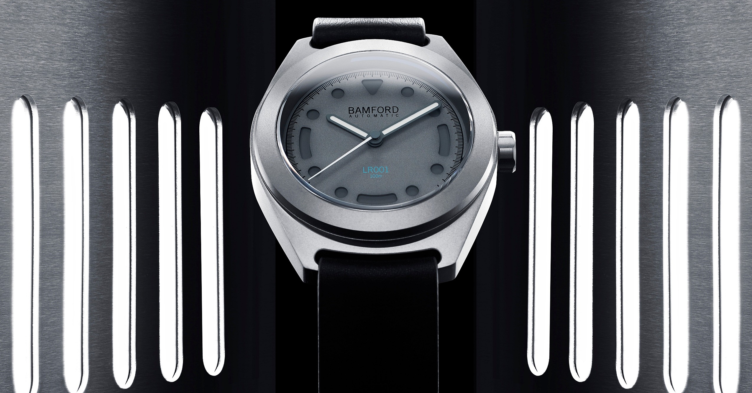 A toned gray cut-away dial matches the titanium case in the daytime while emitting a subtle green hue in low-light, allowing the restrained LR001 text, Bamford’s aqua blue signature at six-o-clock, and most importantly, the time to be seen at all hours.