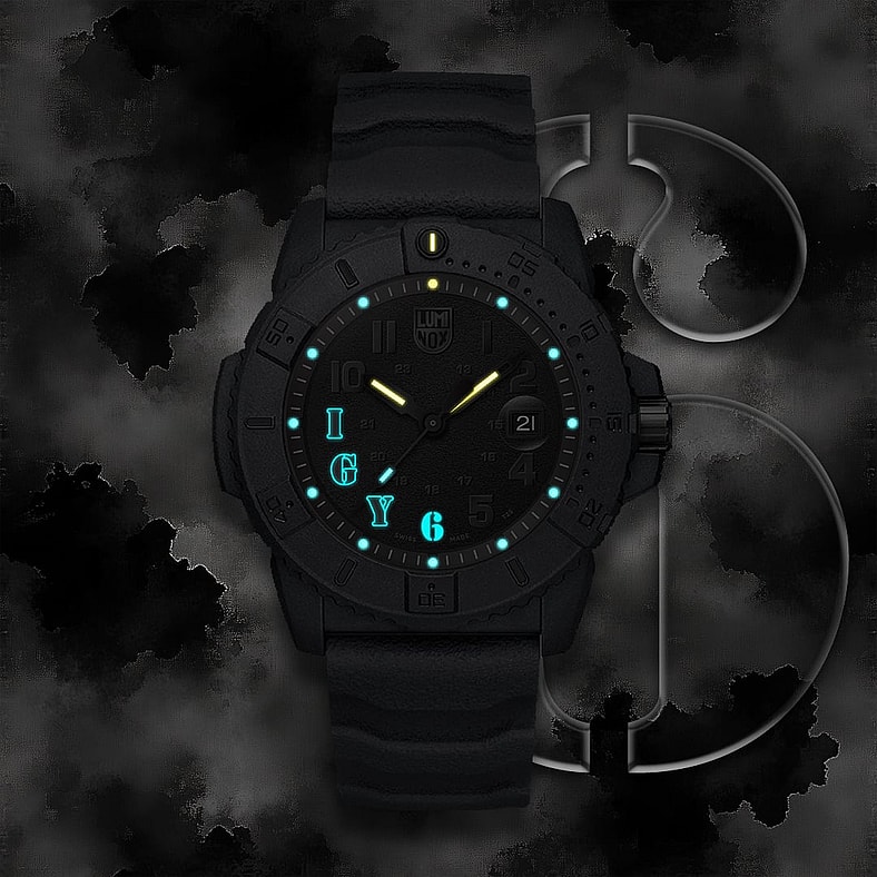 Originating from fighter pilot terminology, “I GOT YOUR 6” refers to the position directly behind someone. In military units worldwide, this mantra embodies camaraderie and unwavering support. The “I G Y 6” inscription on the dial between 6 and 9 o’clock, glows brilliantly in dark or low-light environments when charged, thanks to Super-LumiNova technology and pays tribute to the incredible work of the Navy SEAL Foundation. This is in addition to the ice blue and yellow vertically positioned Luminox Light Technology tubes used at each hour around the dial, providing readability in complete darkness.