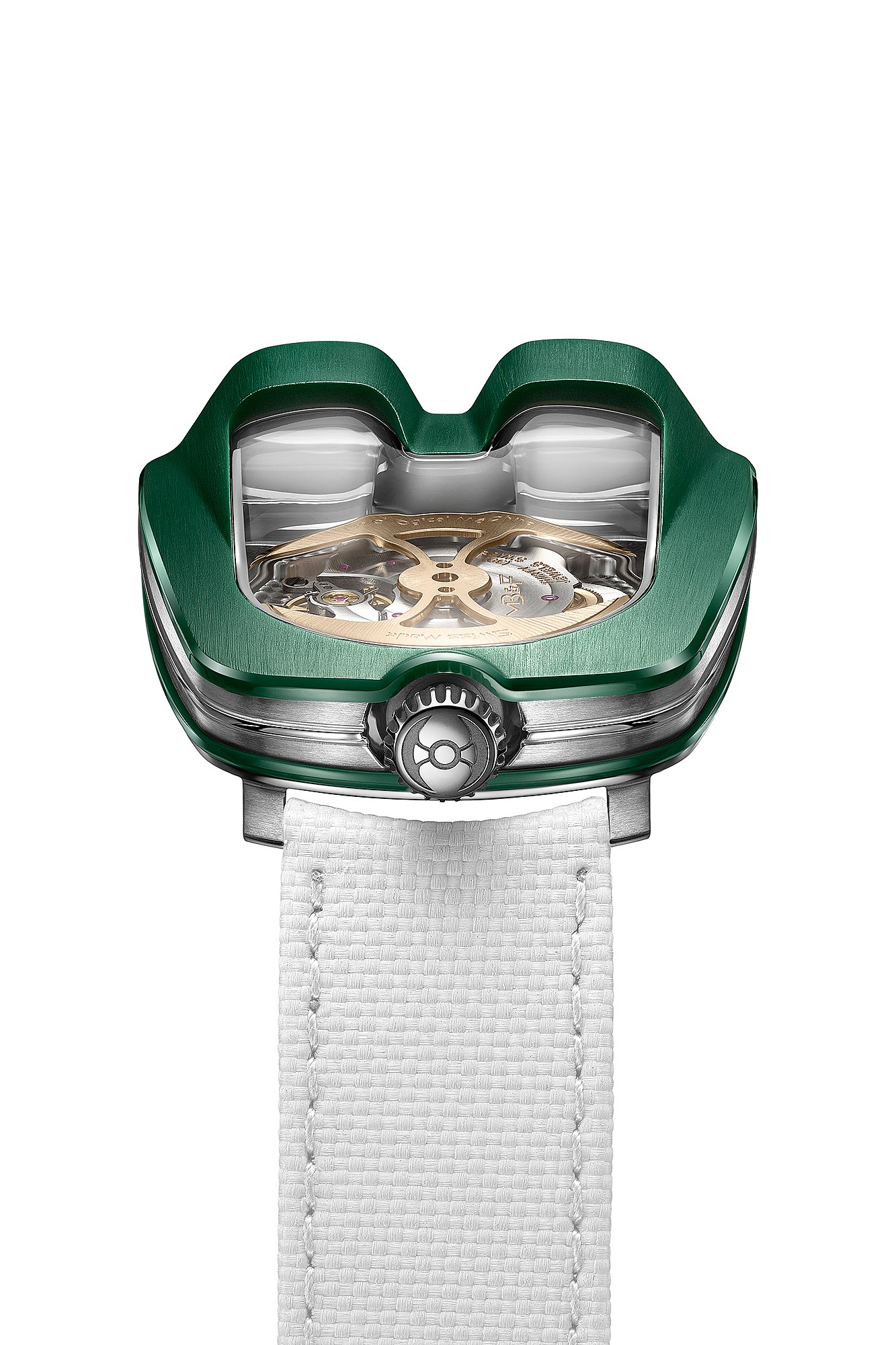 The watch also boasts a double-curved sapphire crystal, which MB&F claims is up to 40-times more expensive than a dome sapphire. The crown is also secured by a “double de-clutch” system that requires a push-in and a three-quarters turn to release.