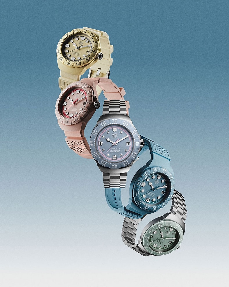 The drop includes a veritable rainbow of poppy colorways, including pastel pink, blue and beige and more refined green and lavender-blue editions accented with diamond-set indexes. One model—the pastel pink version—will be limited to 1,110 pieces, marking the 110th anniversary of the Indianapolis 500 in 2026. All watches in the lineup are powered by Tag Heuer’s Solargraph movement, a light-powered technology first introduced to the Formula 1 collection in 2025. The system allows the watches to run on both natural and artificial light, with as little as one minute of sunlight providing enough energy for a full day of operation. A full charge can deliver up to 10 months of power, according to the watchmaker.
