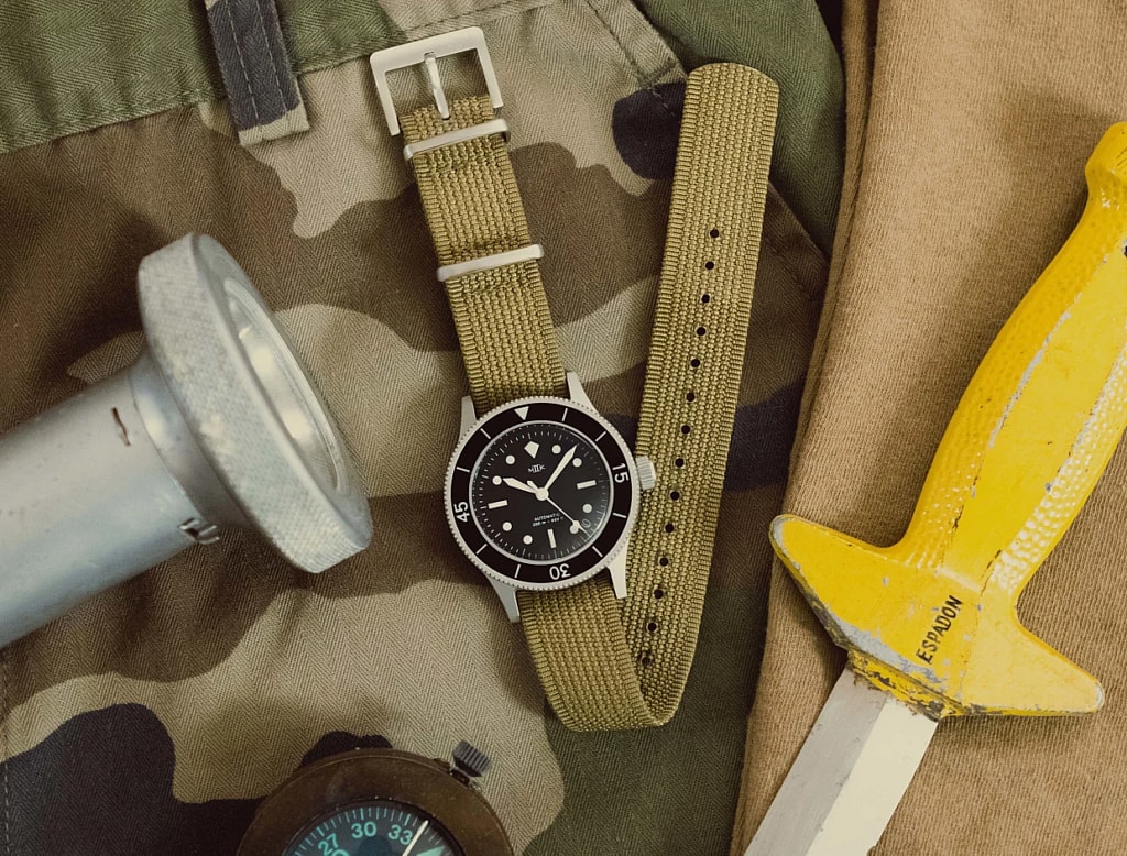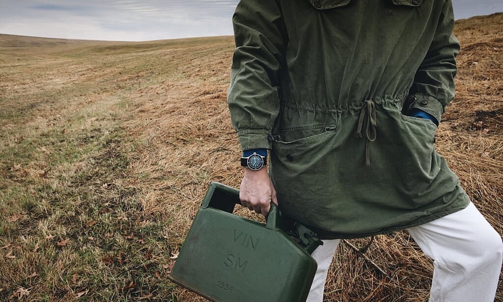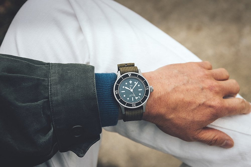 It’s proven a fast-selling watch already, a given when you consider that the watch is a rarity in both the Mk II world and in the watch world at large — it’s priced at less than a grand ($895, to be exact) and yet nods both to an original Mk II watch and the classic Blancpain Fifty Fathoms.