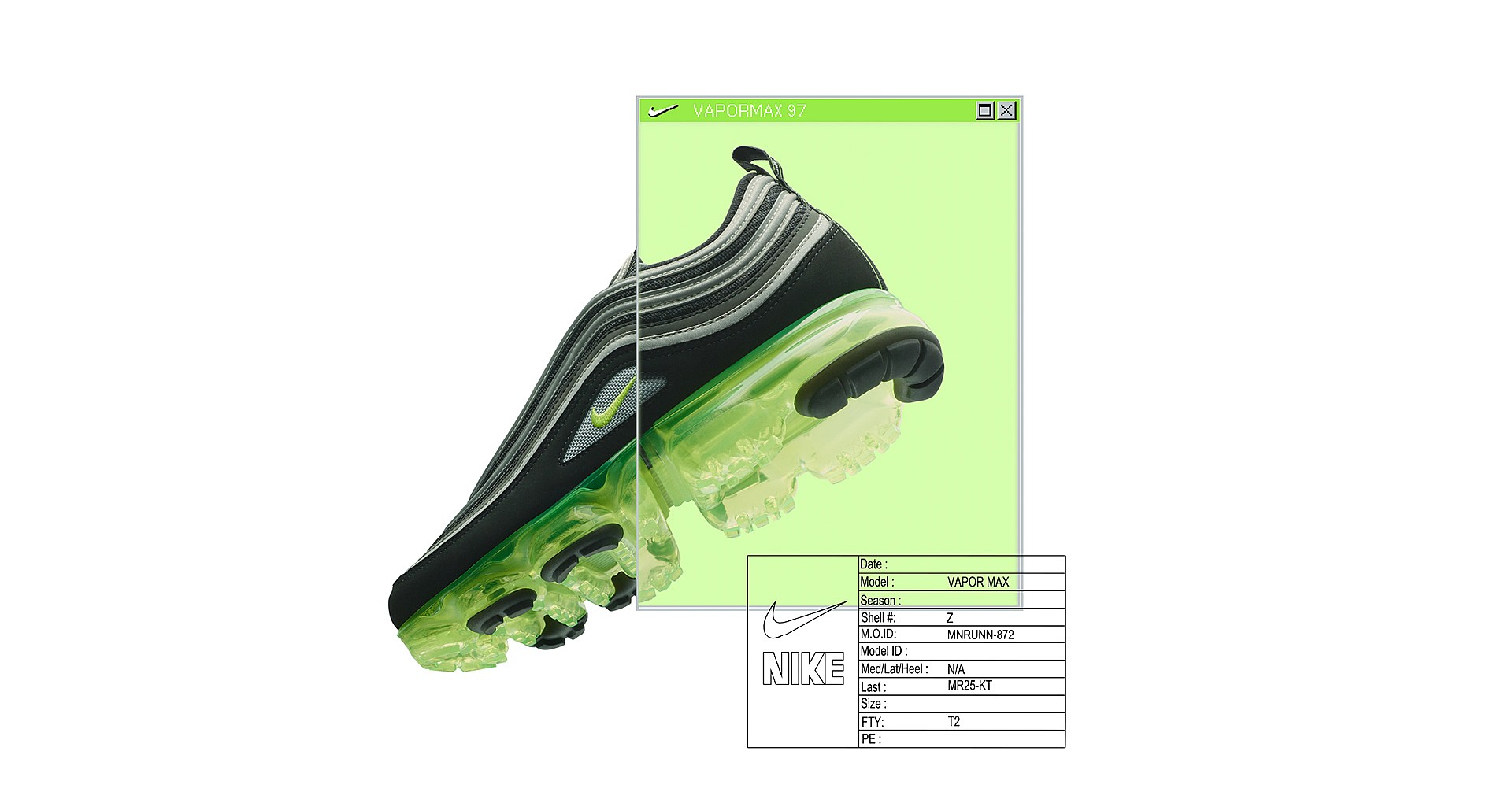 This model combines the upper of the Air Max 97 with the full-length Air-Sole unit of the Air VaporMax.