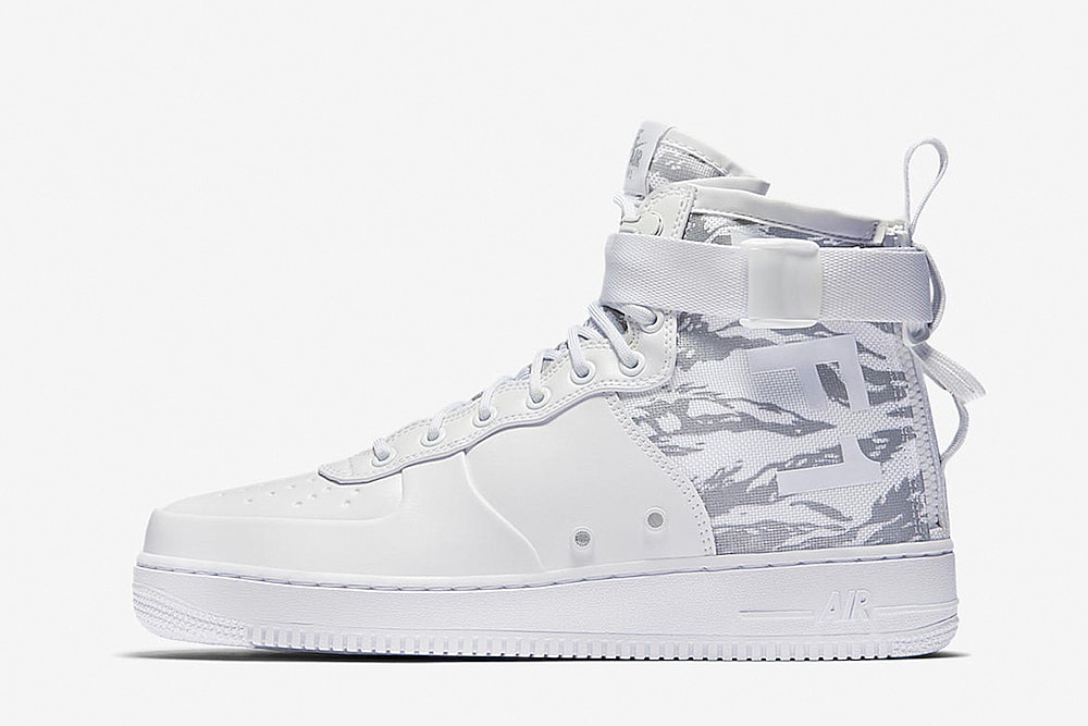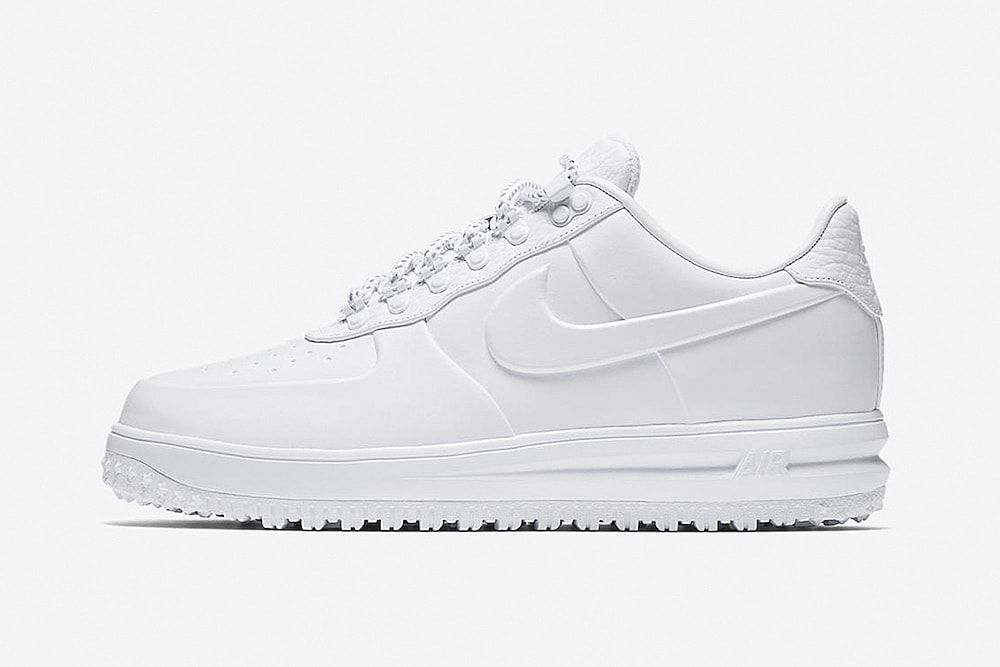 Its most weather-proofed models—the Lunar Force 1 Duckboot, Lunar Force 1 Duckboot Low, SF Air Force 1 Mid and SF Air Force 1 Hi—have been given the all-white treatment, the last two with a touch of white-and-grey camouflage for a wintry kick.