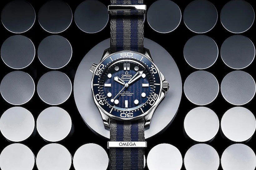 First up: A razor-sharp anodized aluminum bezel in deep blue plays nicely off a laser-engraved blue wave-texture dial, and the design is a nod to Omega’s first turn as 007’s timepiece provider in 1995’s GoldenEye.