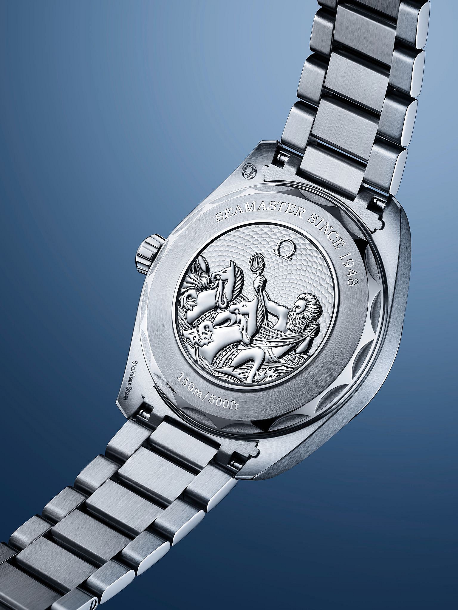 Each model is also outfitted with a caseback commemorating the milestone: In this case, the caseback depicts the Seamaster logo, featuring a trident-bearing Poseidon and two seahorses, one from 1956 and one from the present day.