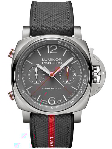 Its tachymeter scale is ideal for nautical use, while its chronograph hands can be reset to zero and restarted with a single push of the crown. Throughout each watch, Panerai used signature touches, like Super Luminova markings on the indices and hands, along with hits of red on the pushers and dial in a nod to the Luna Rossa team colors.