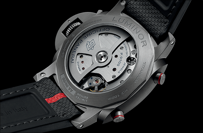 The movement on each watch is visible through a sapphire crystal open caseback, and Panerai notes that the intricate movement within the PAM01654 “embodies the bold and technical ethos of Luna Rossa team and is accented with striking red details and the team decal.”
