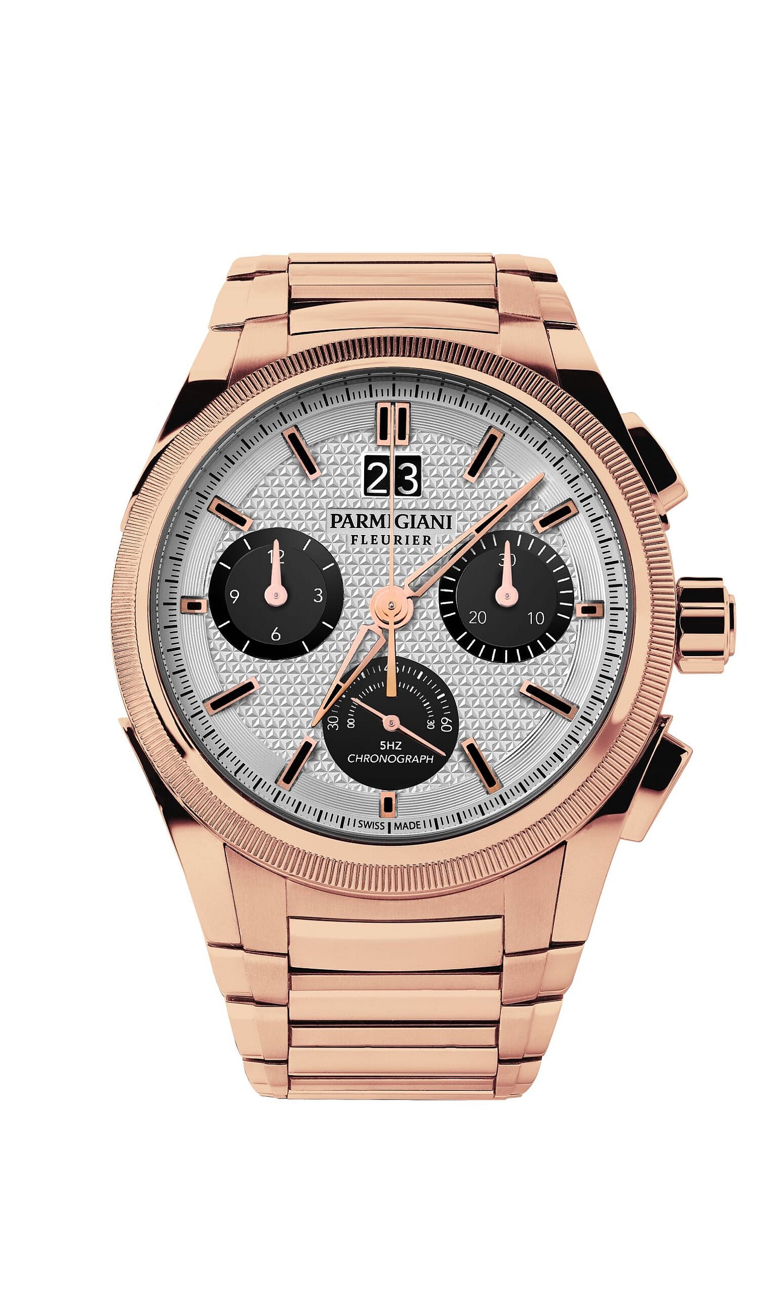 Parmigiani Fluerier’s familiar Delta-shaped hands with black luminescent coating display the time, while the date appears in a large double aperture at 12 o’clock. Subdials at 9 and 6 o’clock display chronograph readouts, and the 3 o’clock subdial serves as both a running seconds and date indicator.