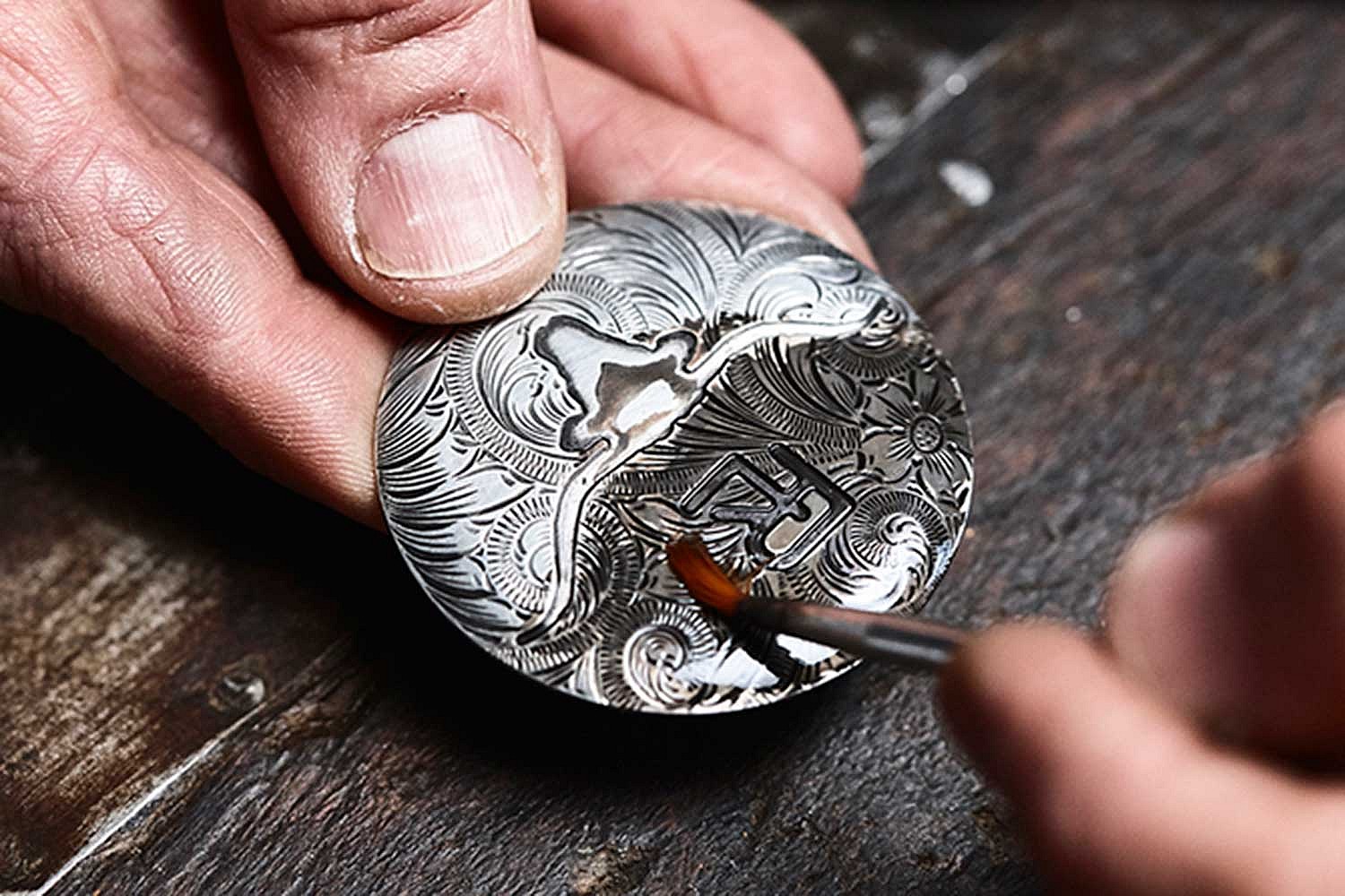 Western belt-inspired detailing drives each watch, with handsome, hand-tooled 42mm cases available in both elegant sterling silver and stunning rose gold. The matching American leather straps boast detailing as intricate as the watches themselves, taking aim at both rodeo and concho belts, complete with American craftsmanship and Italian finishing.