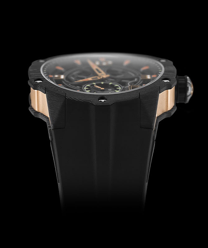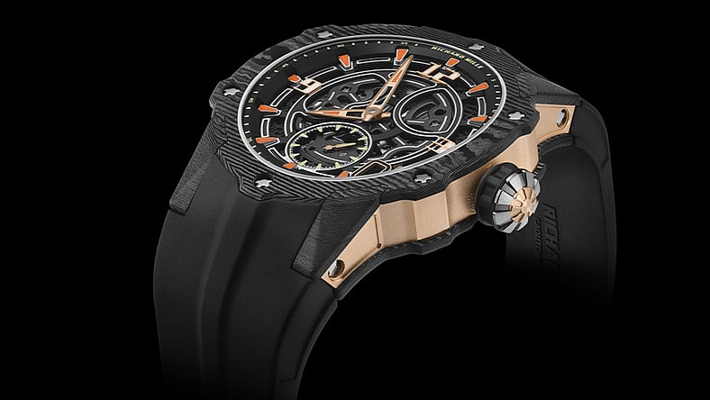 For starters, there’s the impossibly slim 3.28-mm build of its skeletonized automatic RMXP3 calibre movement, which rests on a titanium baseplate and is mounted on ceramic ball bearings for an exemplary study via “precision in motion,” the watchmaker said. Black PVD-coated bridges give the baseplate rigid durability and “precise surface flatness,” which the haute horologist notes is “key to flawless functioning of the gear train and accurate timekeeping.” For watch lineup that already includes a “Ferrari on the wrist” as of late, down-to-the-millisecond tracking is of the highest order.