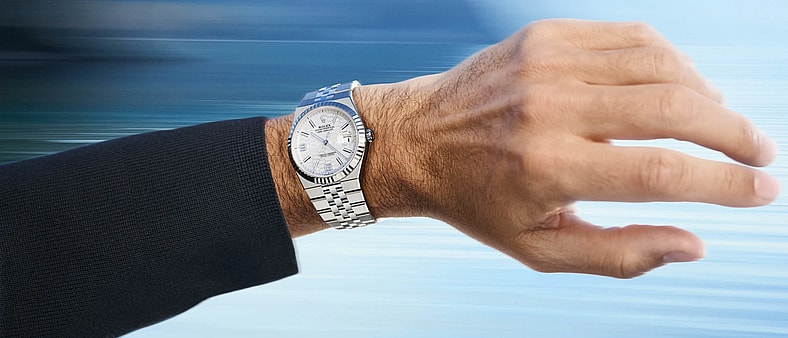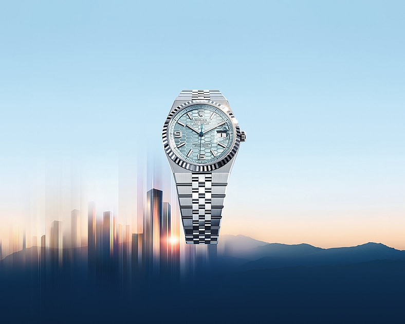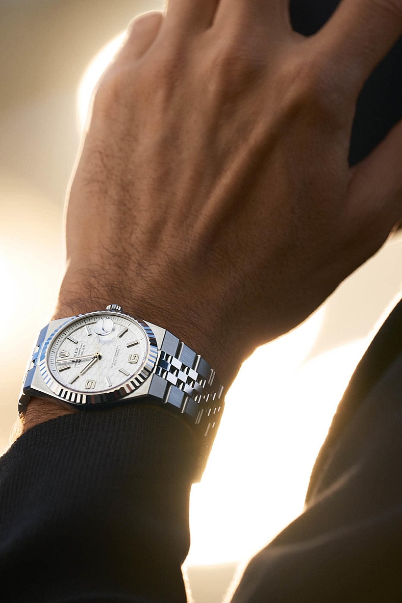 The new Rolex calibre 7135 automatic movement, inspired by the company’s 7140 movement, boasts a 66-hour power reserve, while the bracelet closes with a “crownclasp” feature for a further sleek effect alongside its precise inner workings.