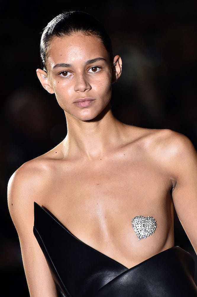The revealing black dress, worn by “it” model Binx Walton, is definitely a head-turner as its architectural bodice leaves one breast entirely uncovered. Binx opted to wear a silver pasty, teasing just enough skin to shock front-row fashionistas.