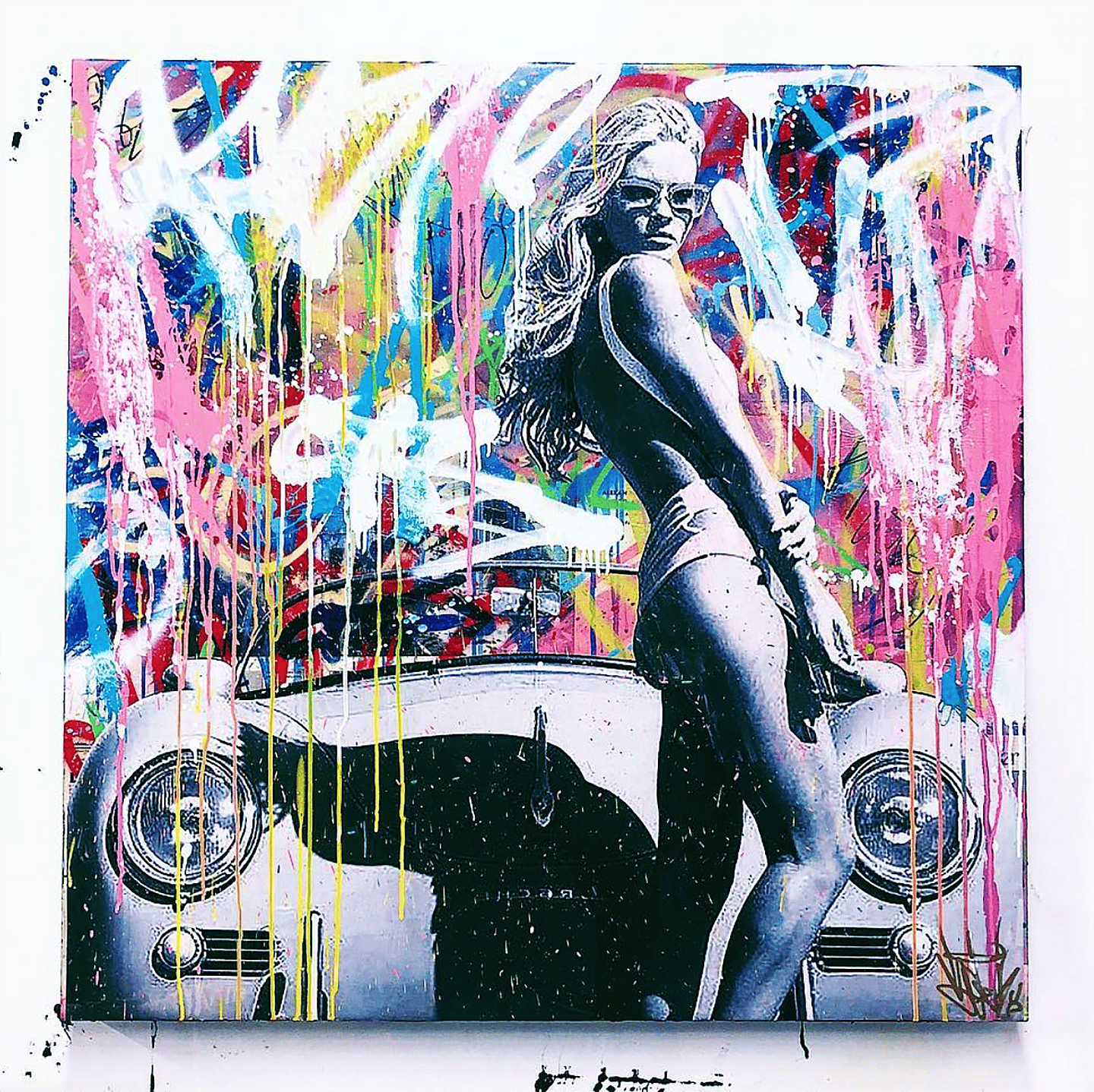 Celebrities are collecting his poppy paintings–a blend of “iconic figures, vintage media and street style.”