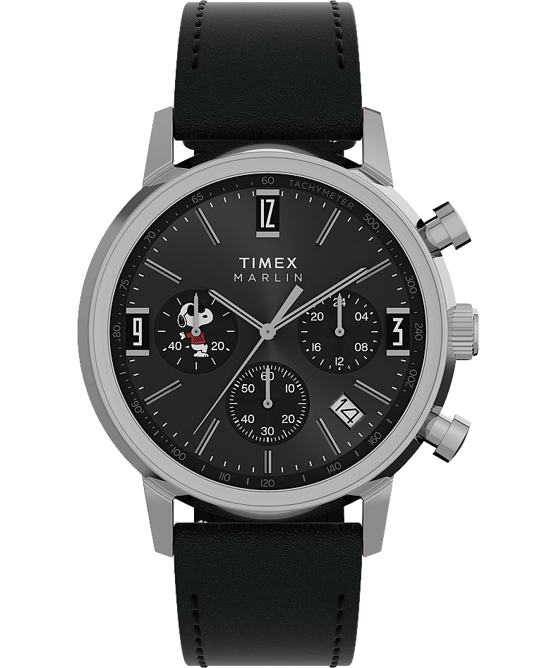 The latest Snoopy Timex comes via the ’60s-inspired Marlin, which previously inspired collaborations with designer Todd Snyder. The black-dialed 40mm chronograph features a tachymeter index, a date window between 4 and 5 o’clock, vintage-style square markers at 3, 9, and 12 o’clock, and, naturally, Snoopy’s Joe Cool striking a pose in his signature red sweater and dark sunglasses at 9 o’clock.