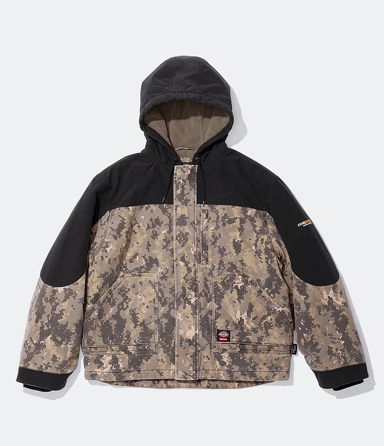 A Cordura hooded work jacket also manages to fuse field-ready functionality with an air of downtown cool, with a denim fabrication that’s lived-in right out of the box (and yet made to be broken in further, from the half pipe to the dive bar). The Supreme x Dickies Fall Collection also offers a camo variation of its hooded work jacket, while subtle co-branded patches tend to appear on lower hand pockets in a subtle “in the know” sort of way.