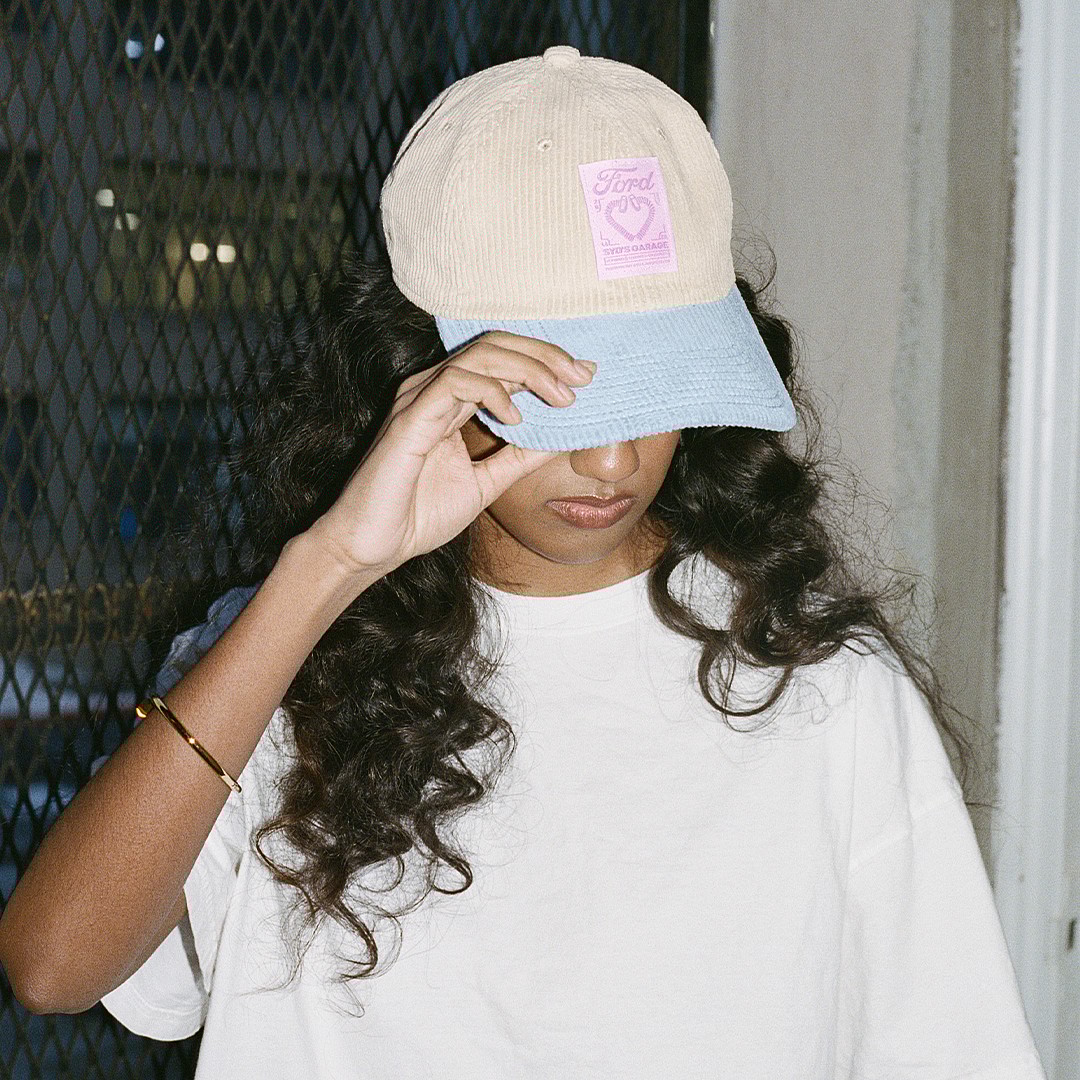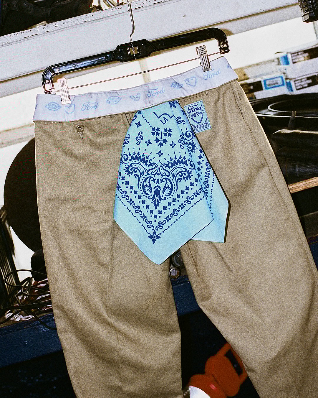 A corduroy baseball hat with a light blue lid and a pink Ford x Syd’s Garage badge serves as Sweeney’s favorite piece “because it’s this universal item that can be worn every day.” A baby blue bandana with a paisley pattern rounds out the all-inclusive collection.