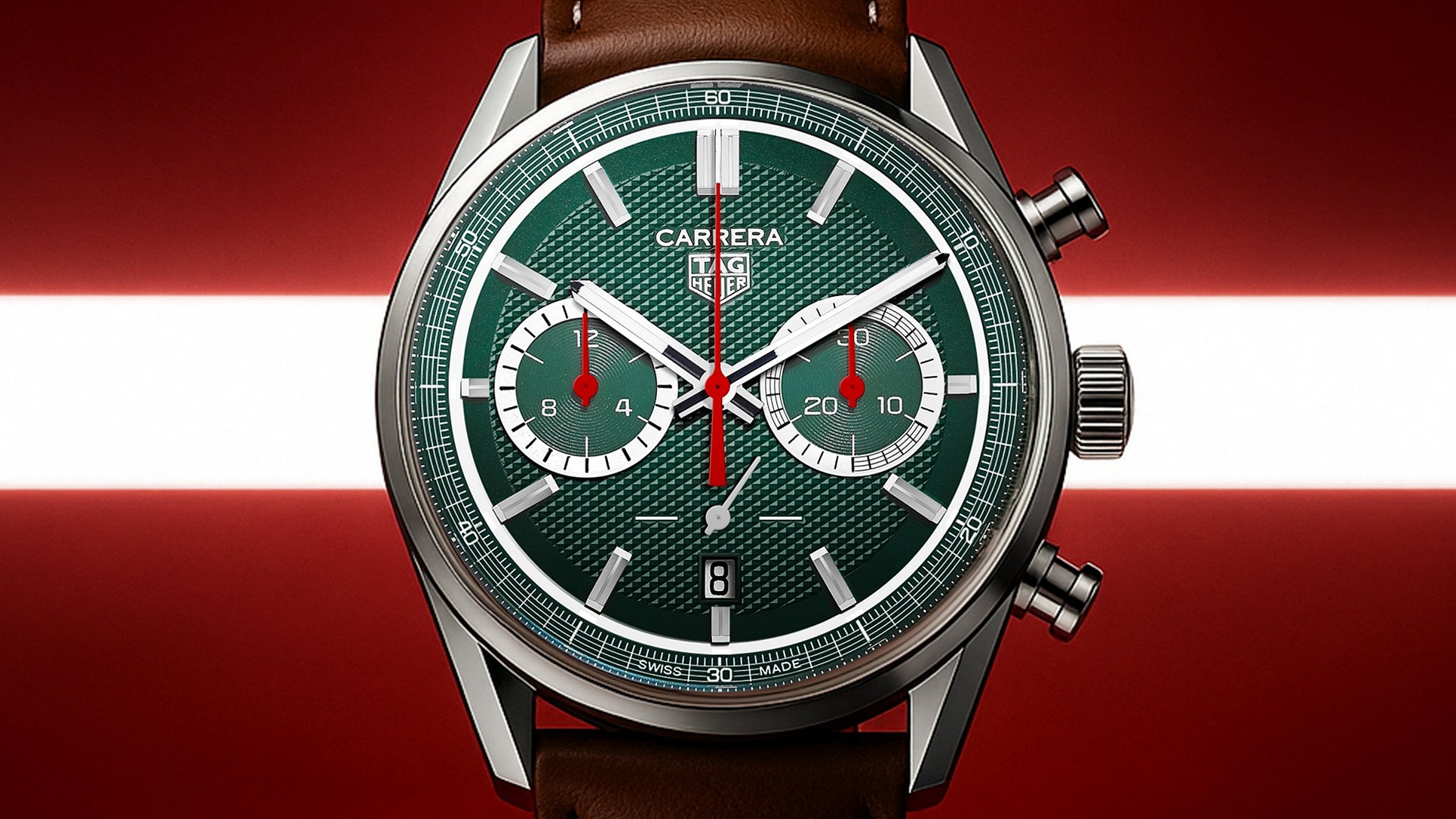 Tag’s official return to the grounds of Goodwood House in West Sussex naturally calls for a new Carrera, the model whose name is is most often associated first with the Porsche 911 and then Tag Heuer’s motorsport-inspired range of watches. Featuring a dial in British racing green inspired by the eponymous Goodwood Green and sophisticated hobnail texture, complemented by red accents, and a brown leather rally strap harks to the golden era of no-holds-barred racing of the 1970s.