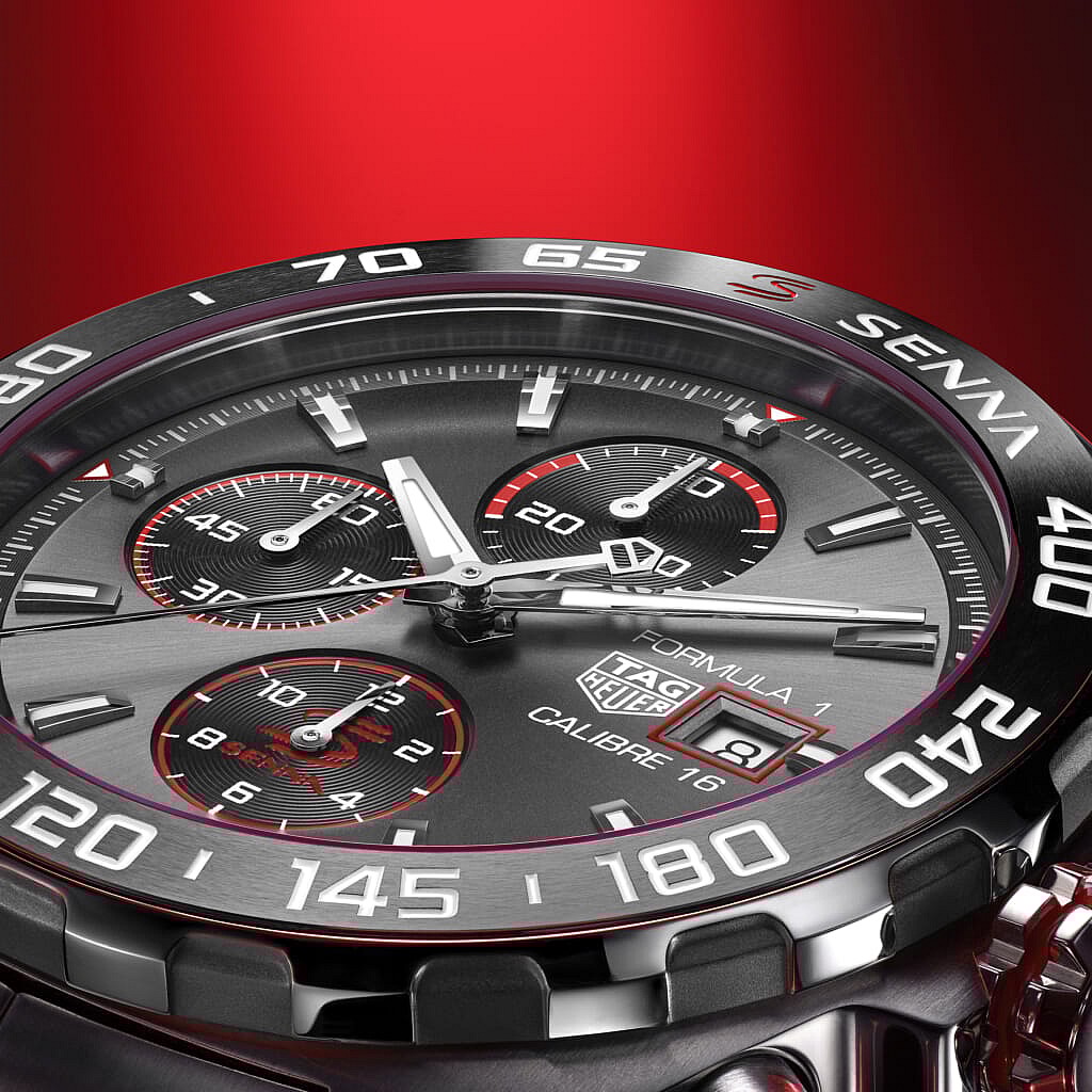Red accents are featured prominently throughout the 44mm timepiece, referncing the hue featured on Senna’s first Tag Heuer watch. Red lacquer is visible on the 2 o’clock pusher, in the crown, and at 12 o’clock in the double S—the Senna brand’s logo.