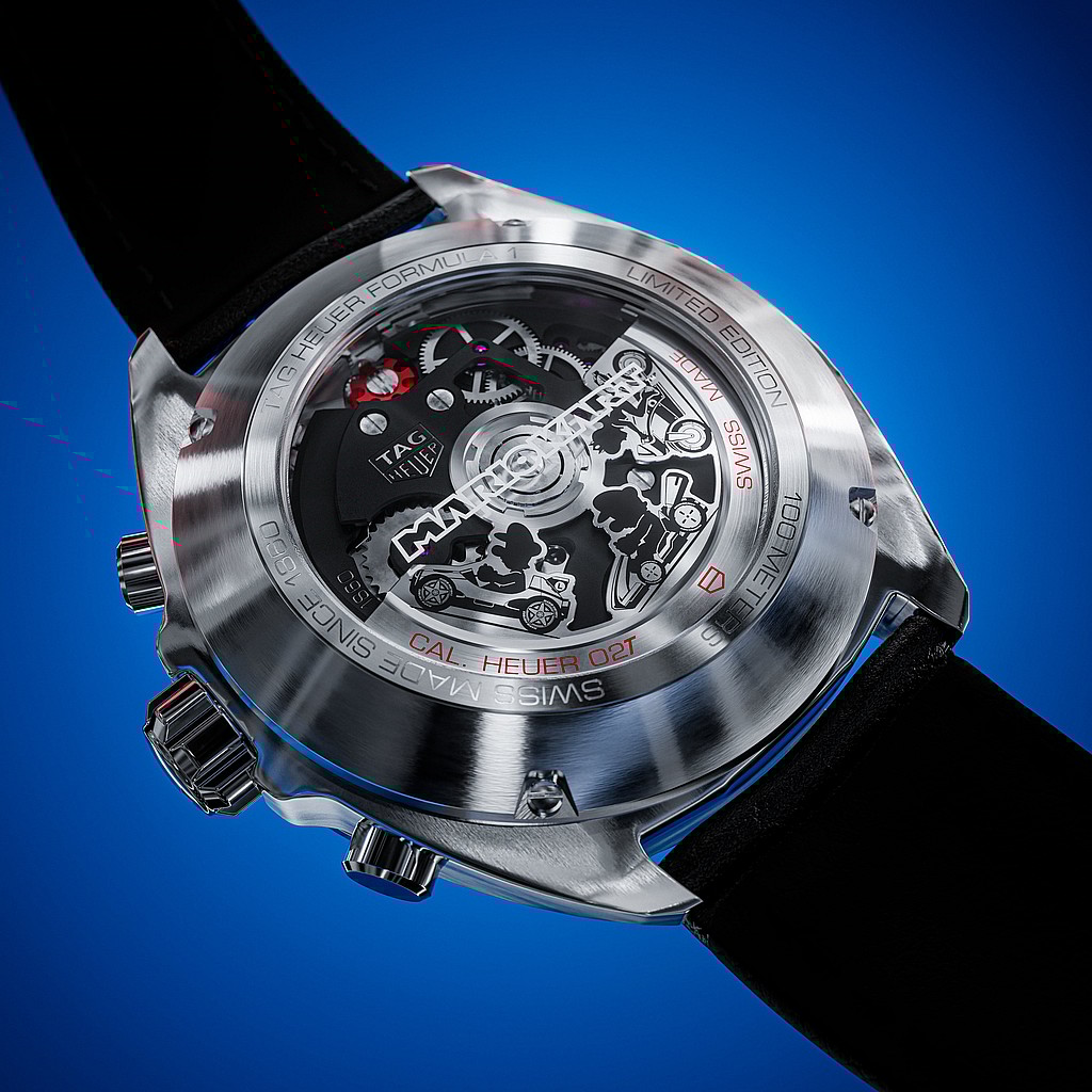 Other Mario Kart logos appear on the pusher, black polished ceramic bezel, and sapphire caseback, through which high-precision COSC-certified Calibre Heuer 02T movement can be viewed in action.