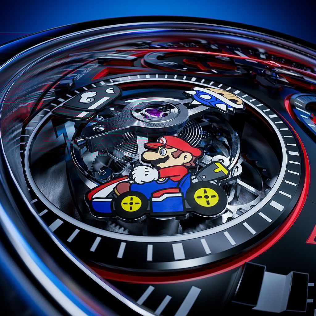 This $25,600 tourbillon chronograph features Mario and two adversaries in a never-ending race.