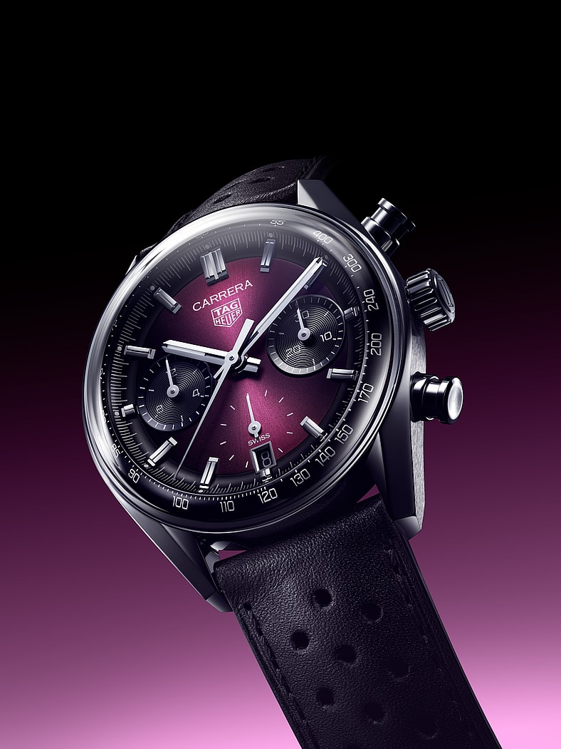The Tag Heuer Carrera Chronograph Tourbillon, meanwhile, conveys what the watchmaker calls a “smoky elegance,” and the distinctive shade of purple also adorns a new edition of the iconic Carrera Chronograph, minus the tourbillon complication. The success of the Monaco Chronograph in the same shade of purple spurred the watchmaker forward. The dial and its sunray-brushed finish “work with the “dimensionality of the design, playing with light and depth from every angle,” Tag Heuer noted.