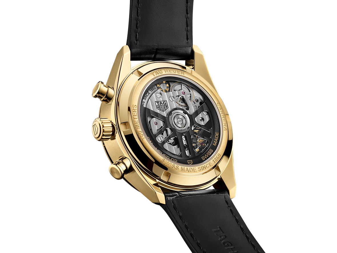 The case back features a sapphire crystal through which the 90-hour Calibre Heuer 02 movement and custom black oscillating mass can be admired. Even the strap follows the pattern, as a large piece of alligator leather pairs with a gold pin buckle.
