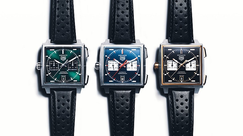 The Tag Heuer Monaco Chronograph has abundant racing heritage built into its performance-minded DNA, and as the watchmaker said, the timepiece “returns in a newly refined form,” namely featuring a 39mm Grade 5 titanium case and a redesigned, more legible dial. The 80-hour power reserve of its in-house Calibre TH20-11 movement also boasts a historically inspired bi-compax layout for a tastefully retooled take on a classic. The sunburst green option is but one of a trio of offerings, including a dial inspired by Steve McQueen’s original Monaco. Starting at $9,350