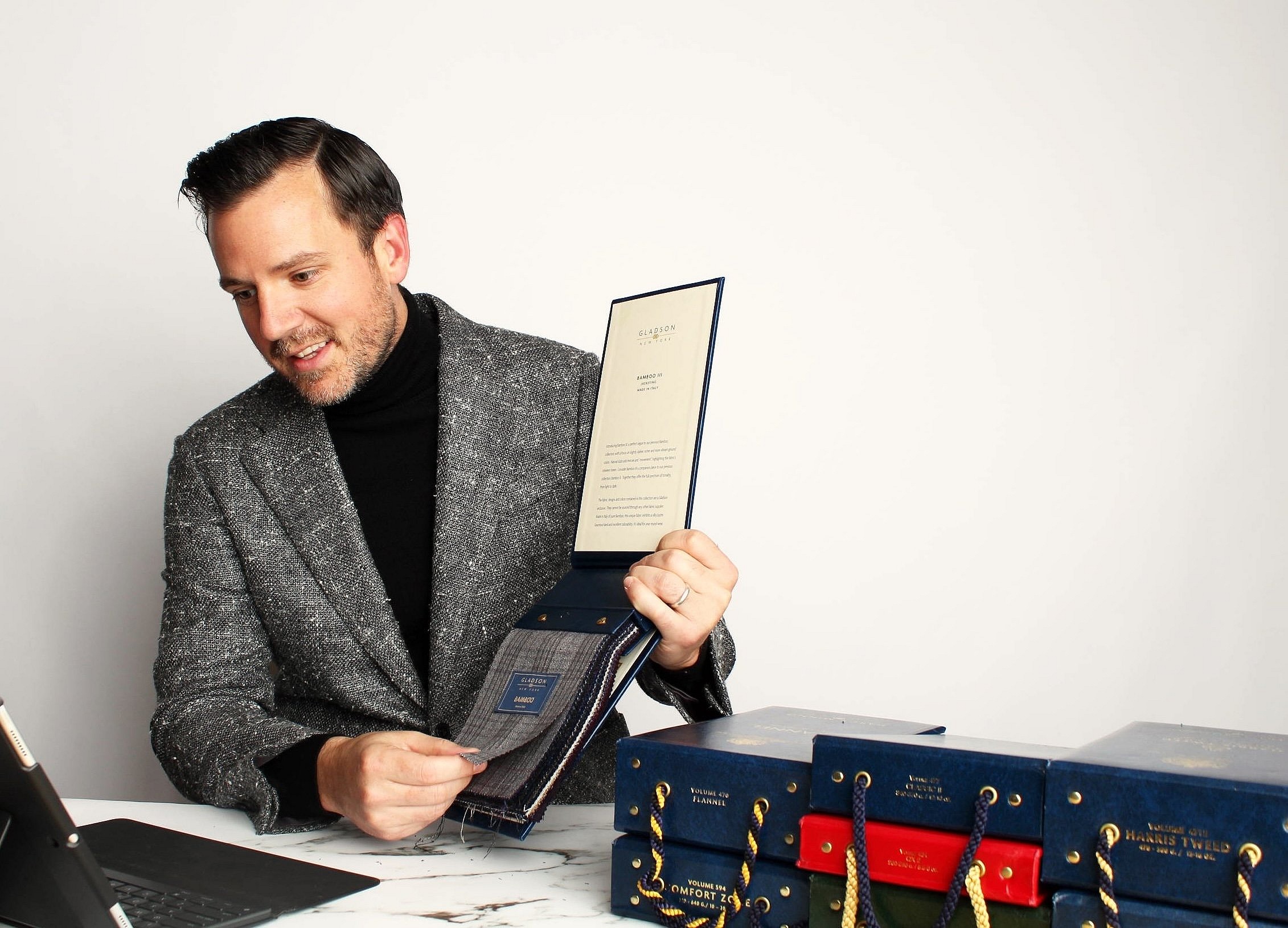 Trepanier and Gladson “work together to create the perfect fabrics that can help our clients dress better in a wide range of occasions, from business, to dates, to evenings out, etc. We make garments guys can live in, and hopefully get better over time, and the fabric is one of the most important elements.”