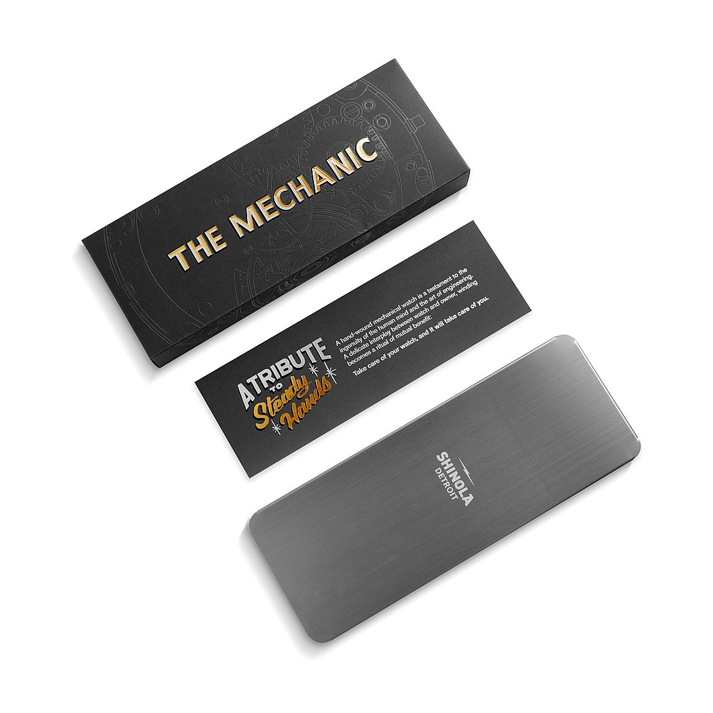 Inspired by old-school sign artisans who painted by hand (known as mechanics for their precision and craft), the timepiece breaks new ground for the celebrated, rugged-meets-refined Detroit company: It’s Shinola’s first manually wound timepiece.