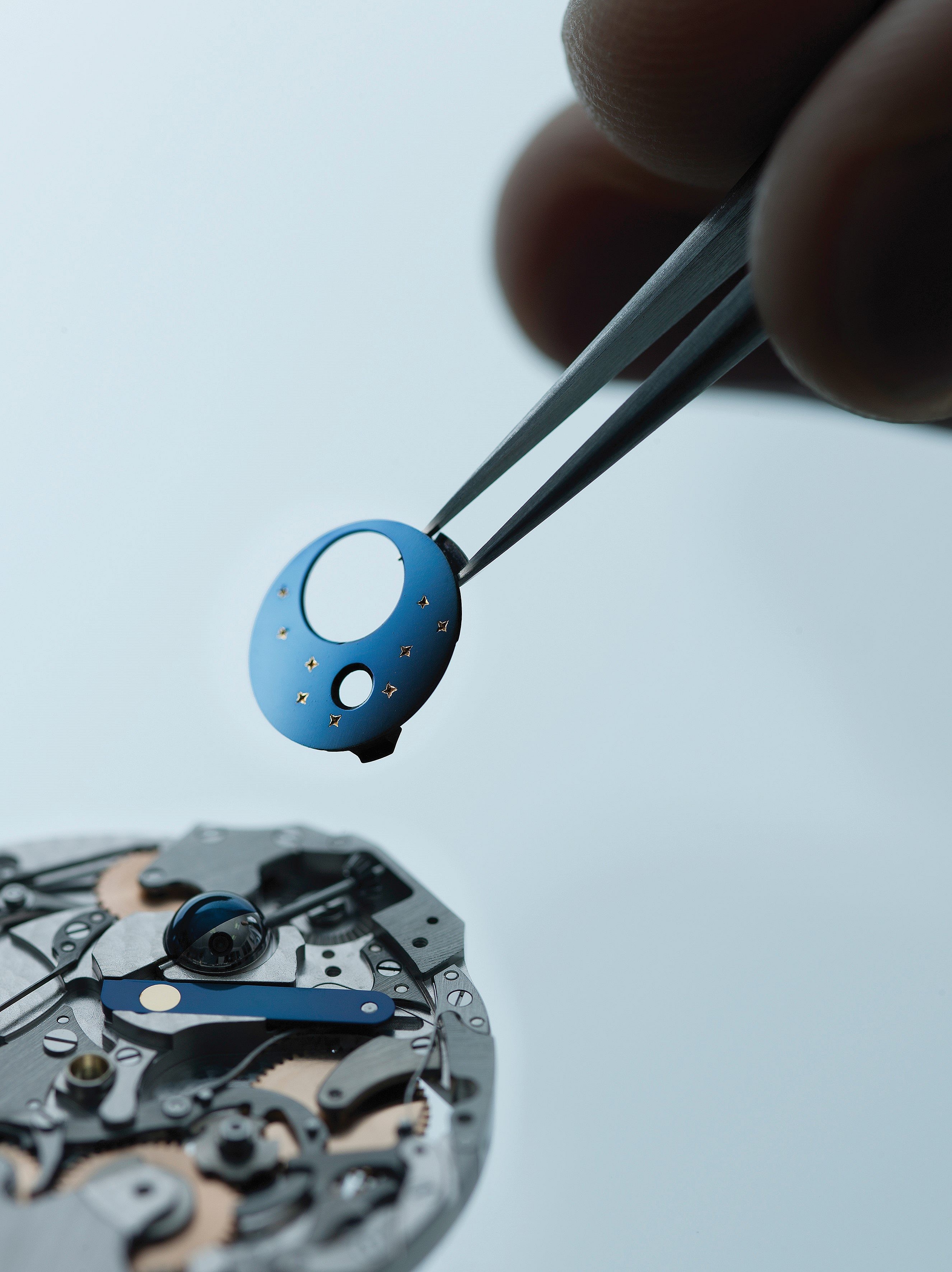 While experimenting with balance wheel treatment, Flageollet inadvertently discovered that titanium heated past a scorching 700 degrees Celsius (1,292 degrees Fahrenheit) will turn a brilliant blue color—one that’s now a hallmark of De Bethune’s design language.
