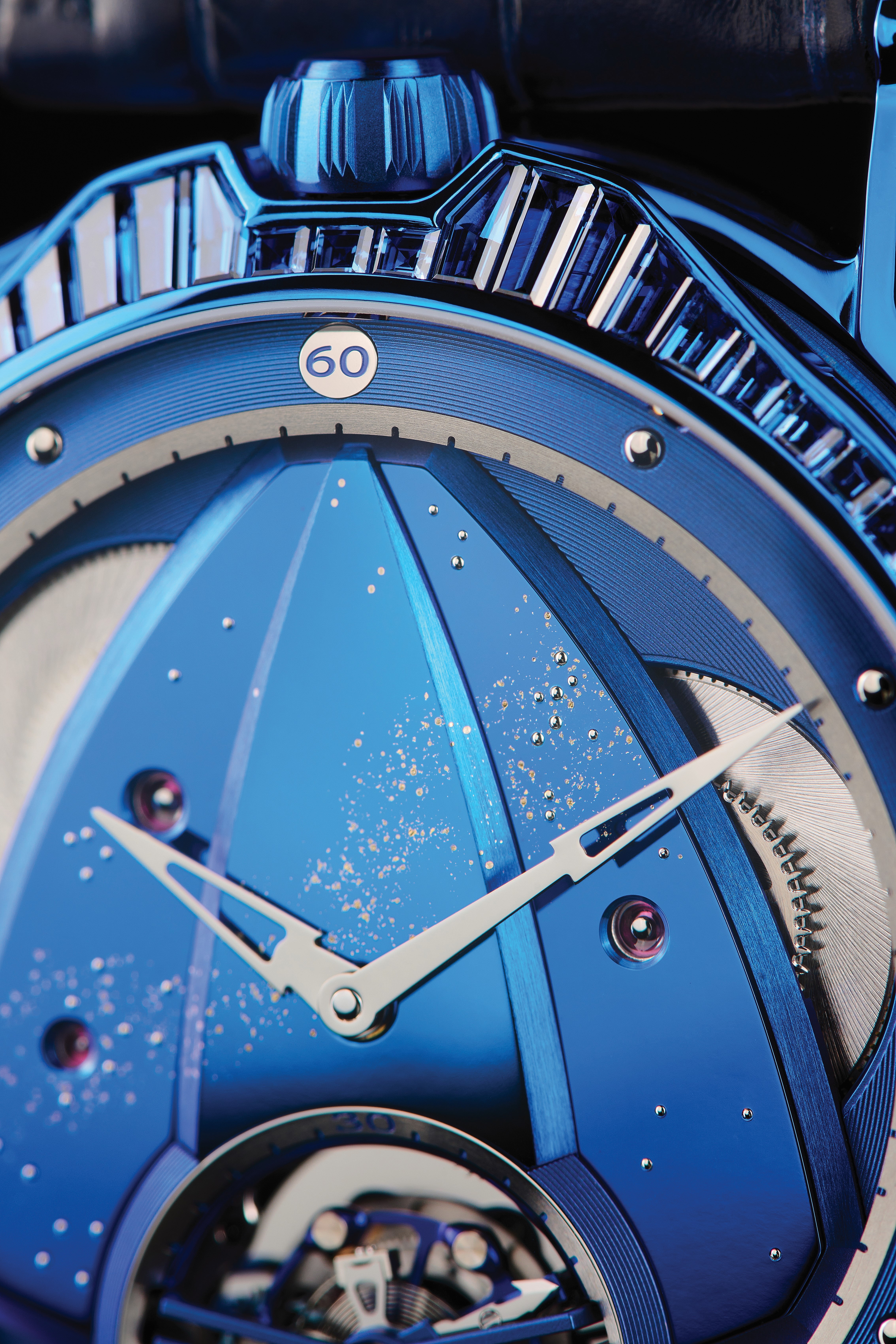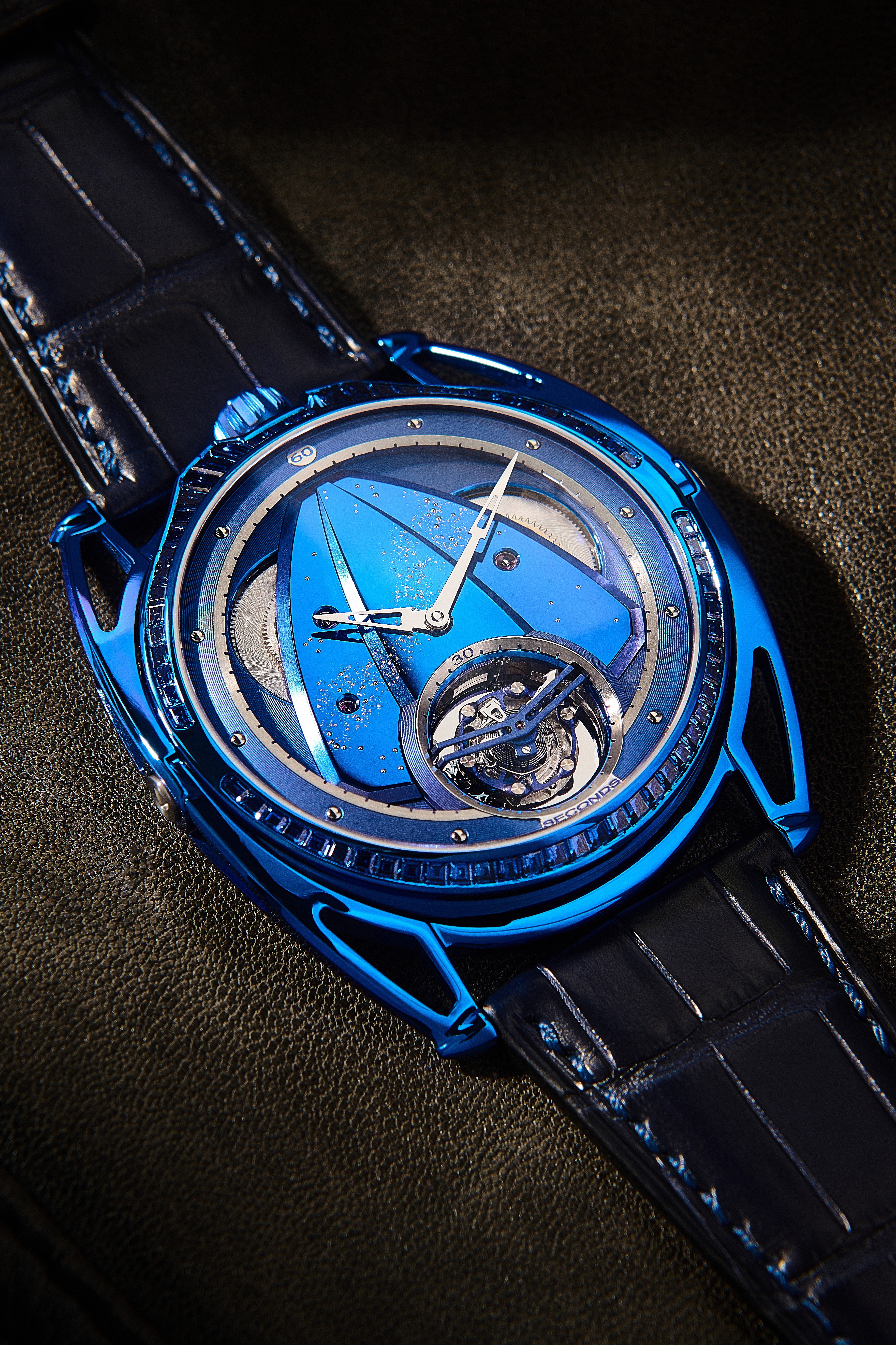 The $315,000 “Kind of Blue” Tourbillon Sapphire’s titanium components were heated past 1,292 degrees to achieve its heavenly hue.