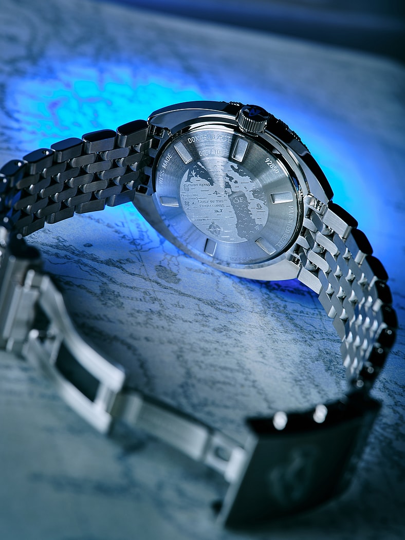 The watch is built with a brushed 316L stainless-steel case, AR-coated flat sapphire crystal, and 250 meters of water resistance. It is supplied with DOXA’s classic beads-of-rice bracelet with wetsuit extension and an additional navy blue FKM rubber strap in a special edition box set.