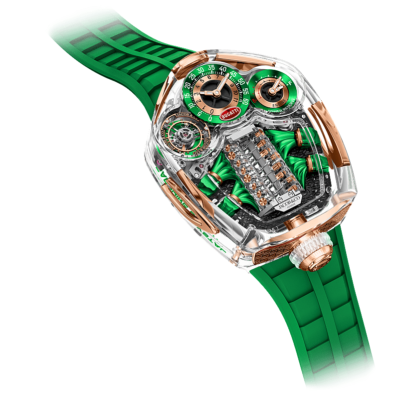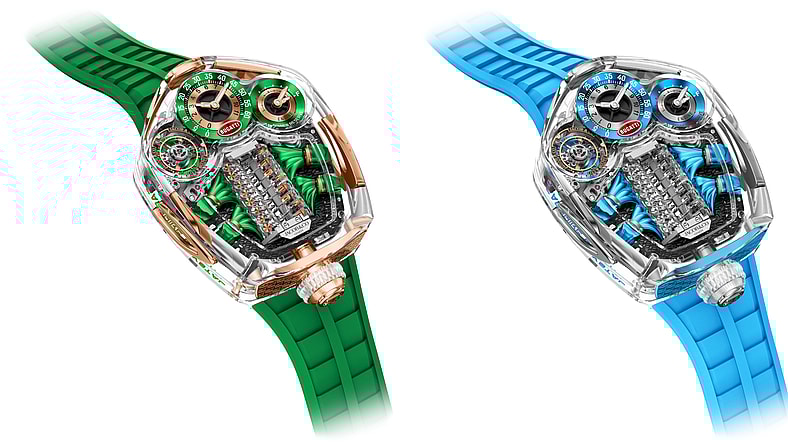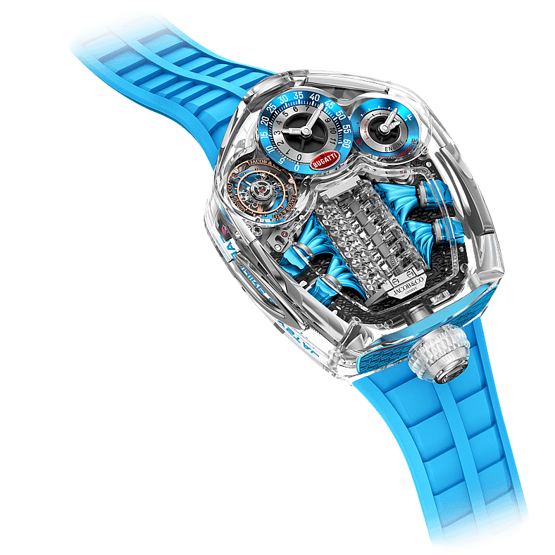 Delivered in both a striking ‘baby blue’ in a nod to its founder (Jacob the Jeweler) as well as signature Jacob & Co. green, the case clocks in at 54 by 44mm and features an astonishing 360 degrees of transparency. Within, the collaboration’s signature built-in V16 engine-shaped automaton is complemented by an auto-inspired tail-light grid and horseshoe-shaped grille, further design details inspired by legendary Bugatti hypercars.