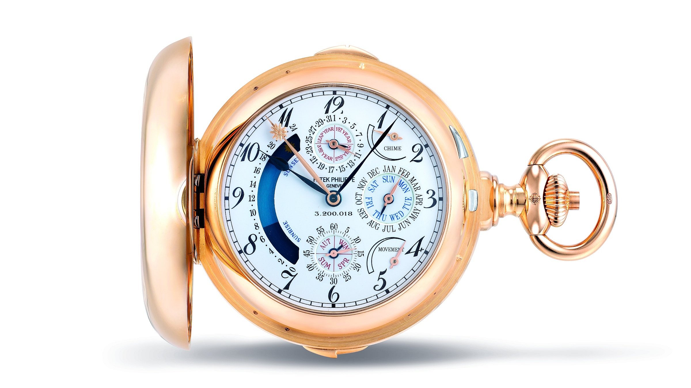 Patent No. 2 deals with the watch’s ability to sound Big Ben’s Westminster Chimes by striking two identical tones in immediate succession, a feat which no mechanical pocket watch since has been able to accomplish. The third patent regards the equation of time, or the name given to the difference between mean solar time and true solar time. As Sotheby’s explains, “Mechanical watches use a special cam mechanism to display the difference, however, if the equation of time is not synchronized with the calendar indicators on the device, it will not be accurate. To correct these errors, the watch would need to be completely taken apart. Patek Philippe overcame these issues by allowing the perpetual calendar mechanism to control the cam.” That same perpetual calendar mechanism also controls the sunrise and sunset indicator.
