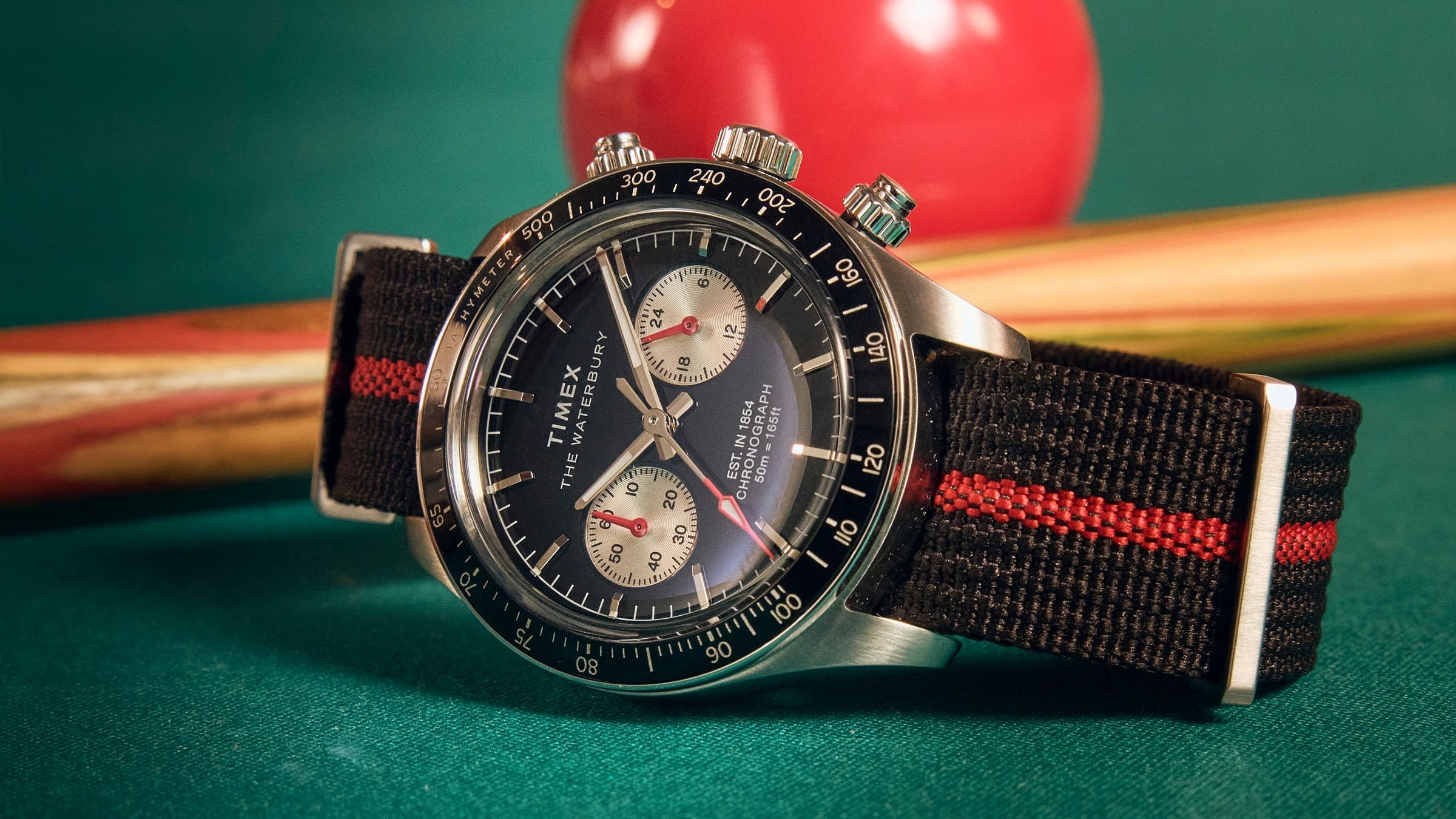 With dials available in black or blue brushed stainless steel, the applied indices, intricate crown detailing, and luminant hands bring contemporary utility to a vintage design that proudly nods to Timex’s 170-year heritage with the denotation “EST. IN 1854, which appears boldly on the bottom portion of the dial above its 50-meter water resistance label. A double-layered recycled fabric slip-through strap, available in either a two-tone blue or black and red to match the chosen dial color, adds a sustainable element.