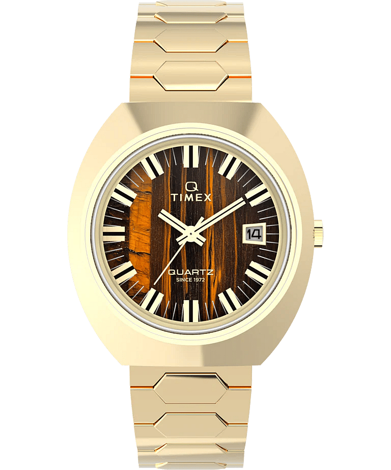 Double-line indices with a thick, contrasting design complement the throwback Q Timex logo and the “quartz” designation above the 6-o’clock marking, along with the phrase “Since 1972,” while the movement within ticks along and remains accurate to milliseconds per day, Timex said. Its “dimensional floating hour markers that hover above the striking tiger’s eye dial” are eye-catching and easy to read, the brand notes, while each timepiece is finished off with a time period-accurate domed sapphire crystal.