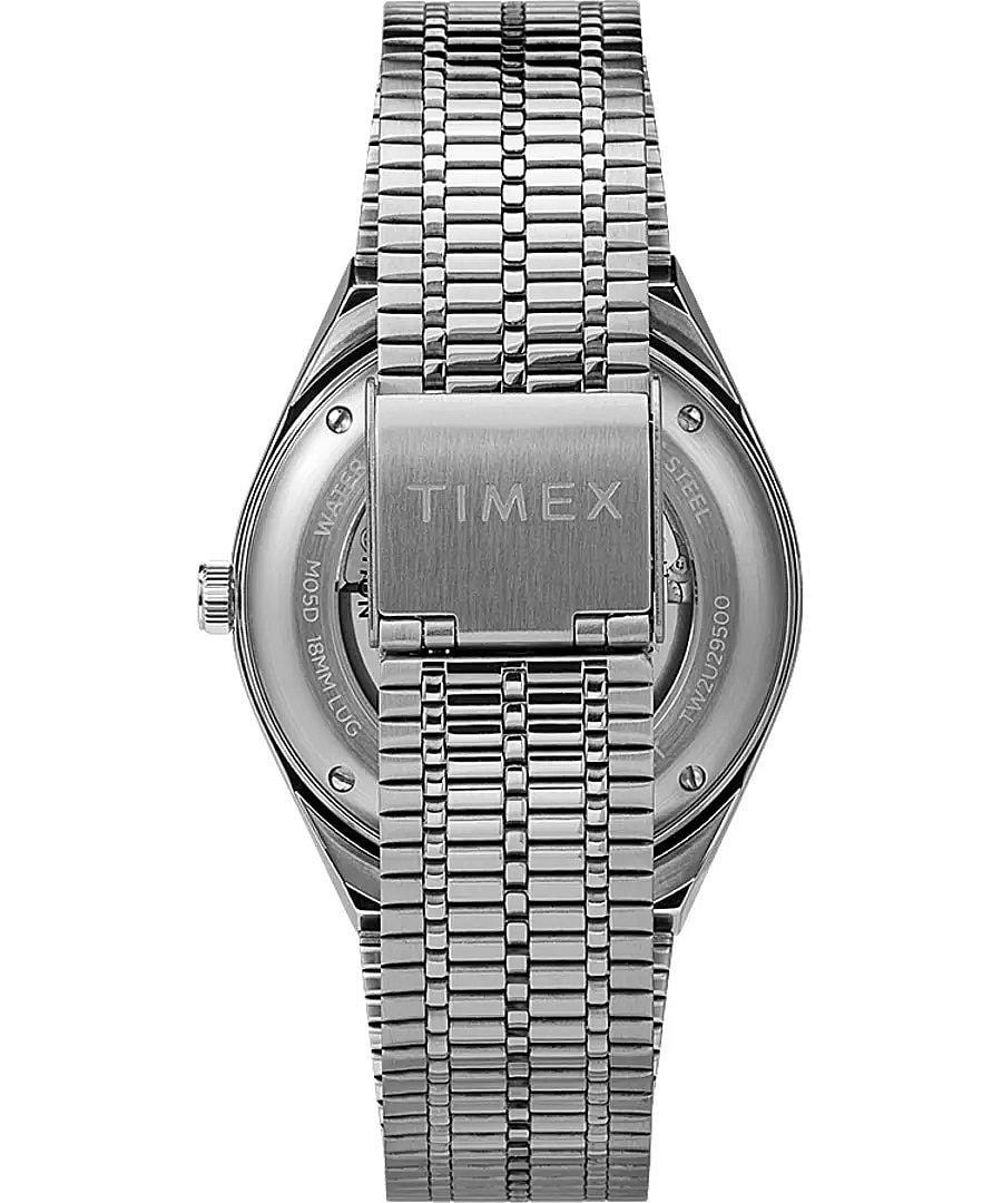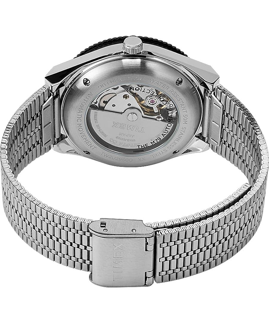 The M79 has the same beloved shaped as the Q Timex 1979 Reissue, but its stainless steel case but sized up from 38 to 40mm. And instead of a battery-powered quartz movement, the M79 has a 21-jewel mechanical automatic movement.