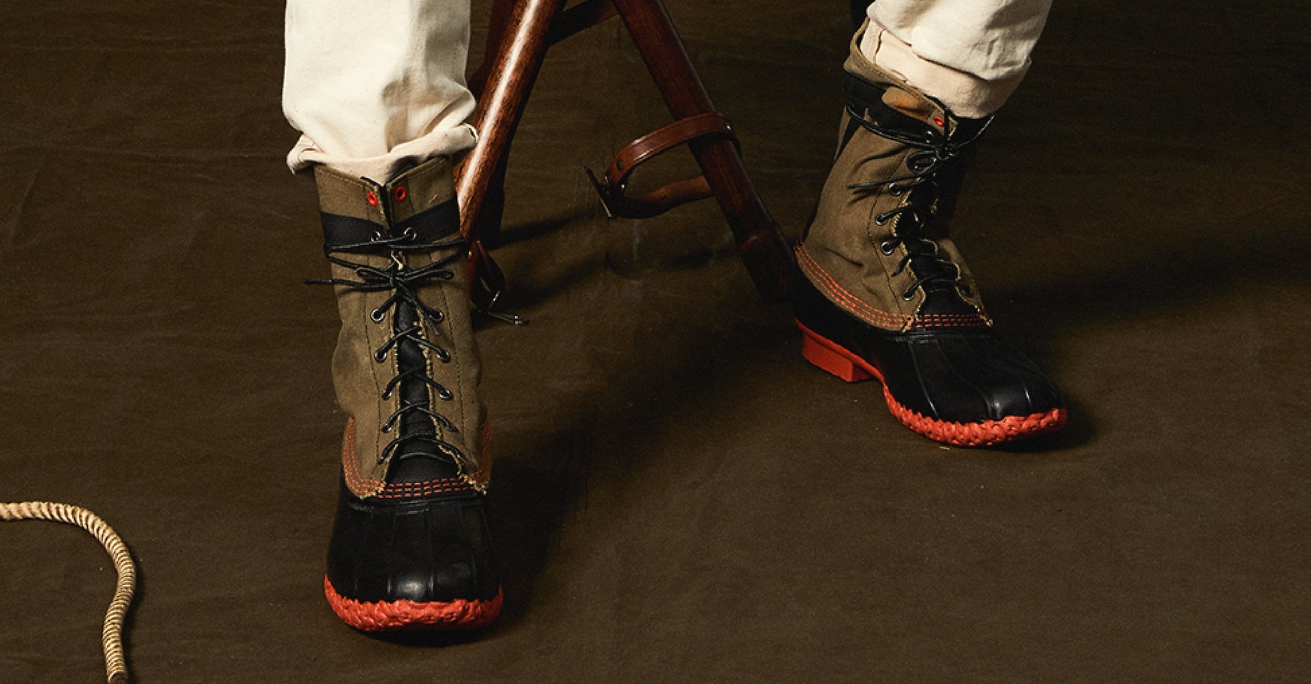 The limited edition Upcycled Collection is headlined by a version of the iconic Bean duck boot. But instead of leather or waxed canvas, vintage surplus military bags and/or tents form the upper. The waterproof rubber lower and leather tongue are rendered in black, while the exterior stitching matches a bright orange sole.