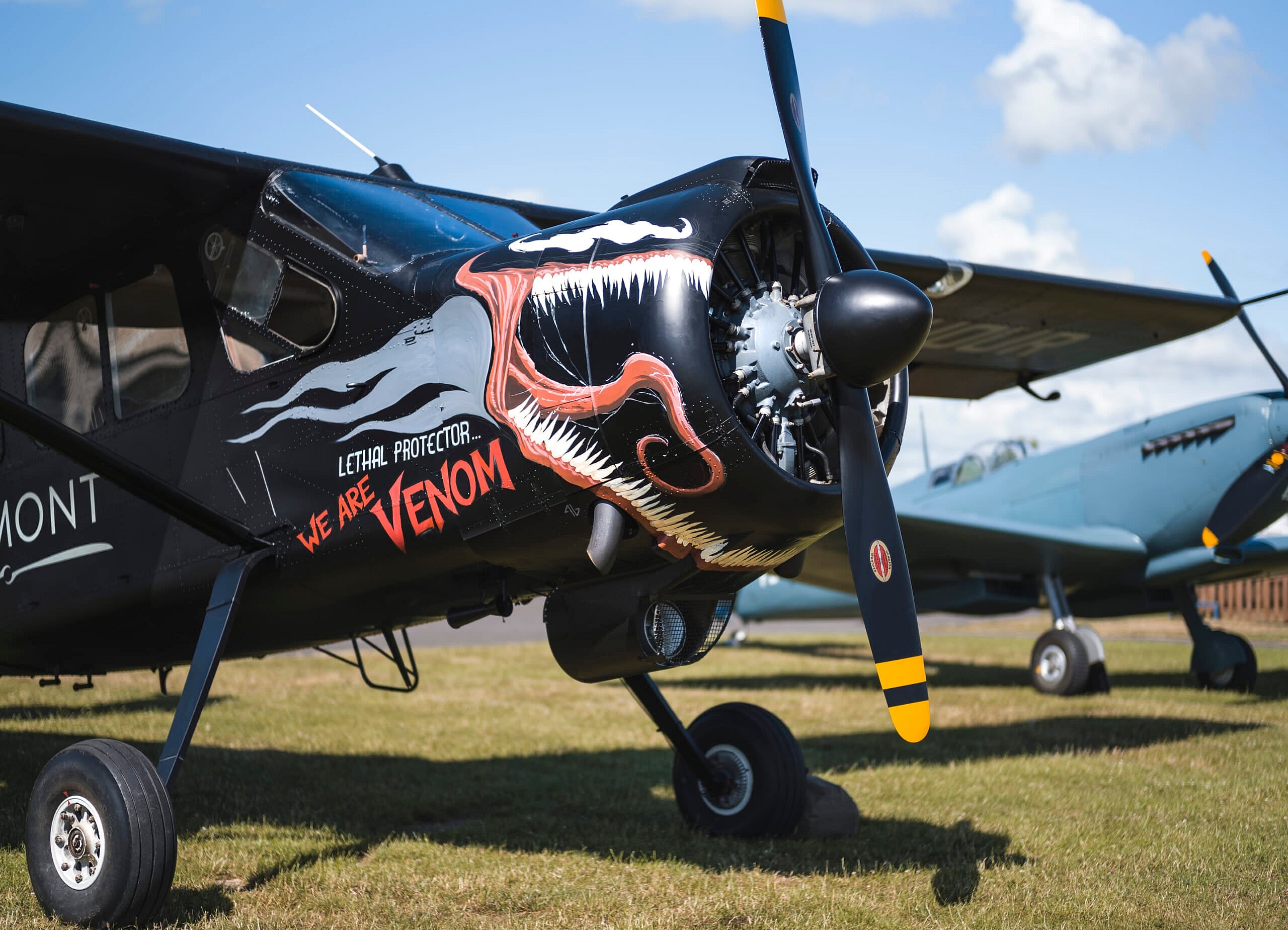In collaboration with Venom studio Sony Pictures Bremont has also painted its prized vintage 1950s French military Broussard aircraft in a tribute to the film and the watch. Inspired by World War II fighters, artist Adi Granov gave the blacked-out plane a menacing mouth full or razor-sharp teeth. The plane is part of the private collection of Bremont co-founders Nick and Giles English.