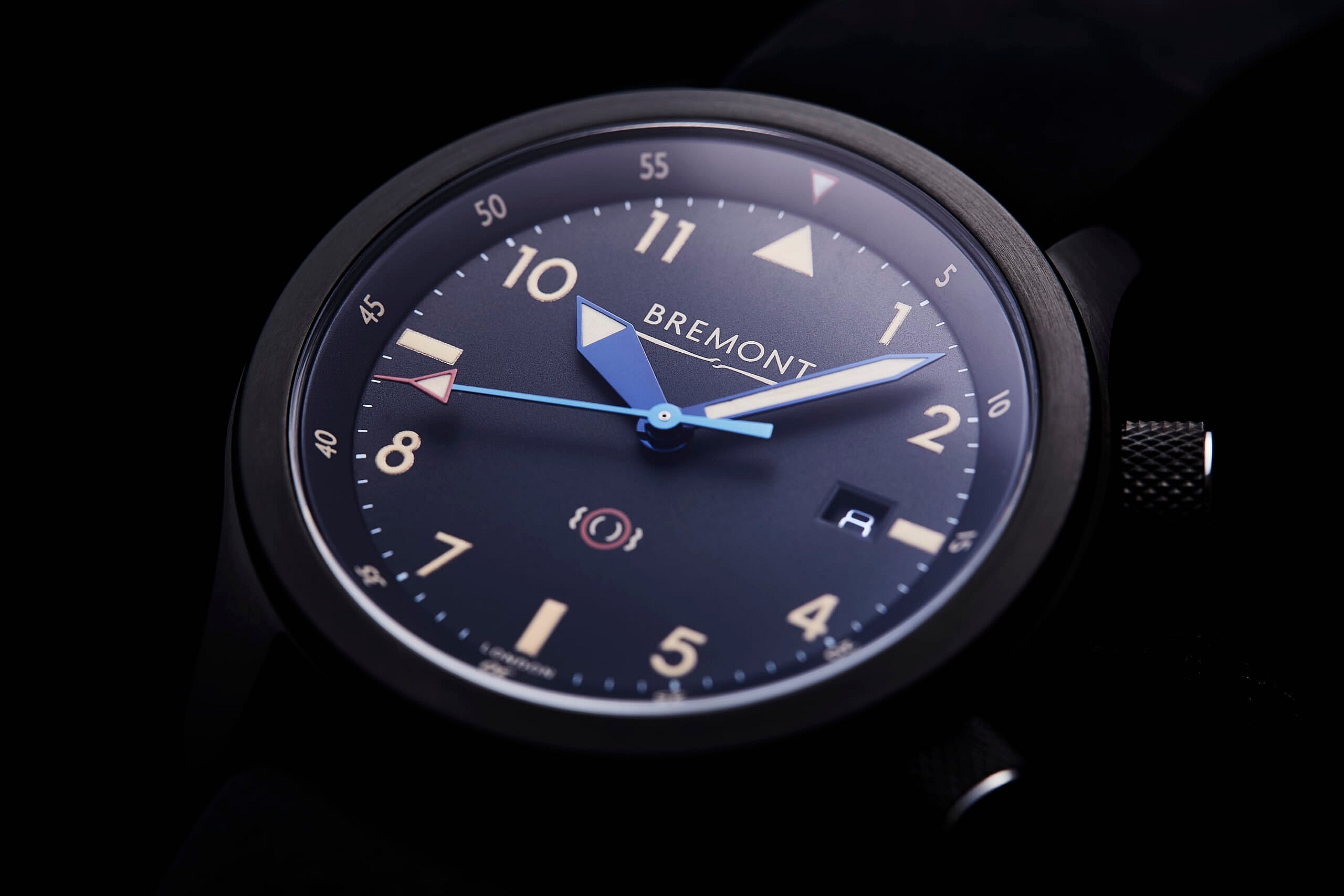 Water resistant to 100 meters (328 ft.) it also features a black smoked glass open caseback, a first for Bremont, through which the movement can be viewed.