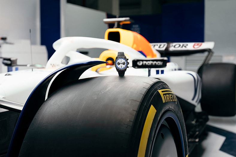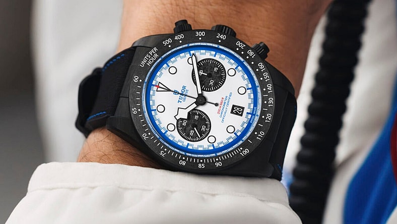Its chronograph sub-dials are done up in carbon fiber, and the material even makes up the end links of the hybrid strap. On the dial itself, blue and white intersect with crisp black in a nod to the Visa Cash App racing colors and livery. Grade A Swiss Super-LumiNova pairs with Tudor’s signature “snowflake” hands, while the chronograph movement within boasts “performance exceeding the standards set by this independent institute,” referring to the COSC, which certifies chronometers.